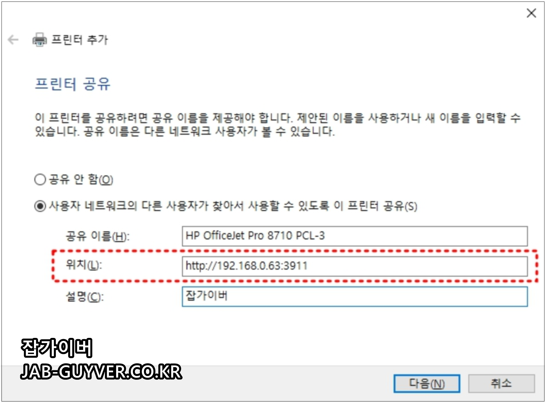 프린터 공유에서 사용자 네트워크의 다른 사용자가 찾아서 사용할 수 있도록 프린터 공유에서 위치를 아까 프린터 주소 IP주소와 설명을 입력하느것으로 프린터 수동추가 완료됩니다.
