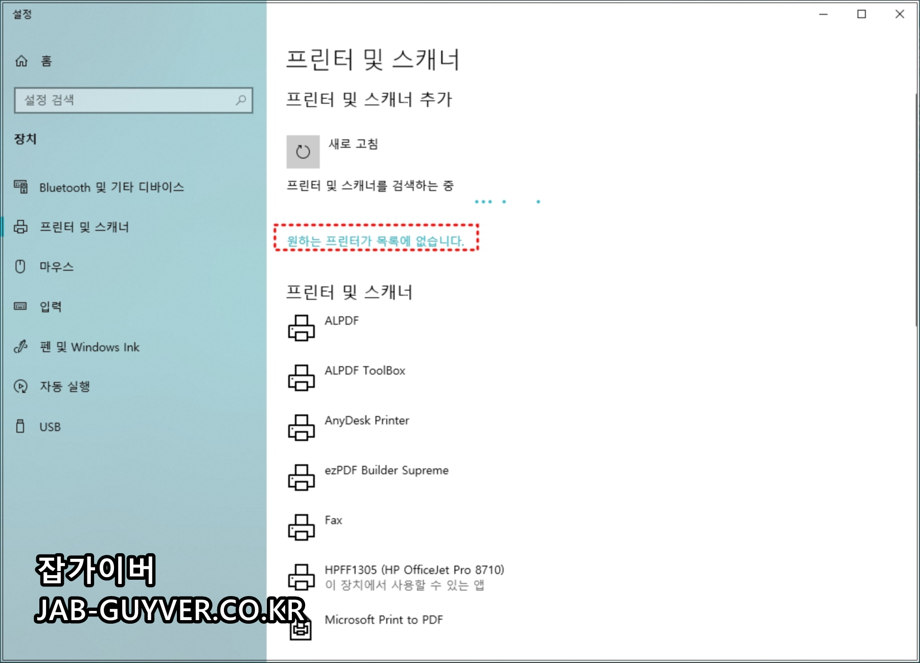 프린터 또는 스캐너 추가하기를 한번 누른 뒤 검색 중 하단에 원하는 프린터가 목록에 없습니다.를 선택해 추가합니다.