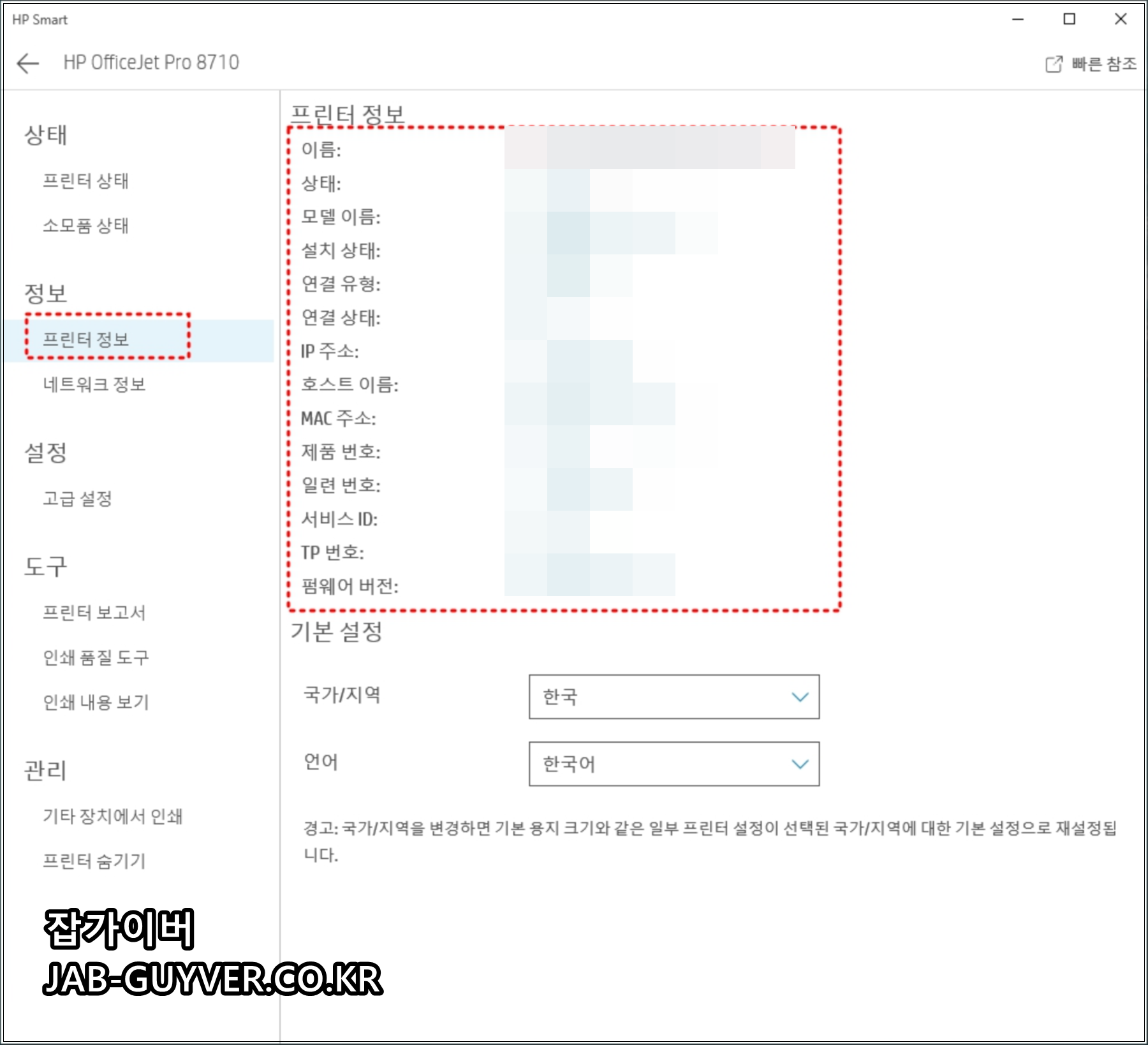 HP 프린터 스마트를 통해 정보를 확인하면 프린터 이름, 상태, 모델 이름, 설치상태, 연결 유형 "네트워크", 연결 상태, IP주소, 호스트 이름, MAC 주소, 제품번호, 서비스 ID, TP번호, 펌웨어 버전 확인할 수 있으며 소모품 주문, 스캔, 문서 인쇄, 모바일 팩스, 사진 인쇄 등이 가능합니다.