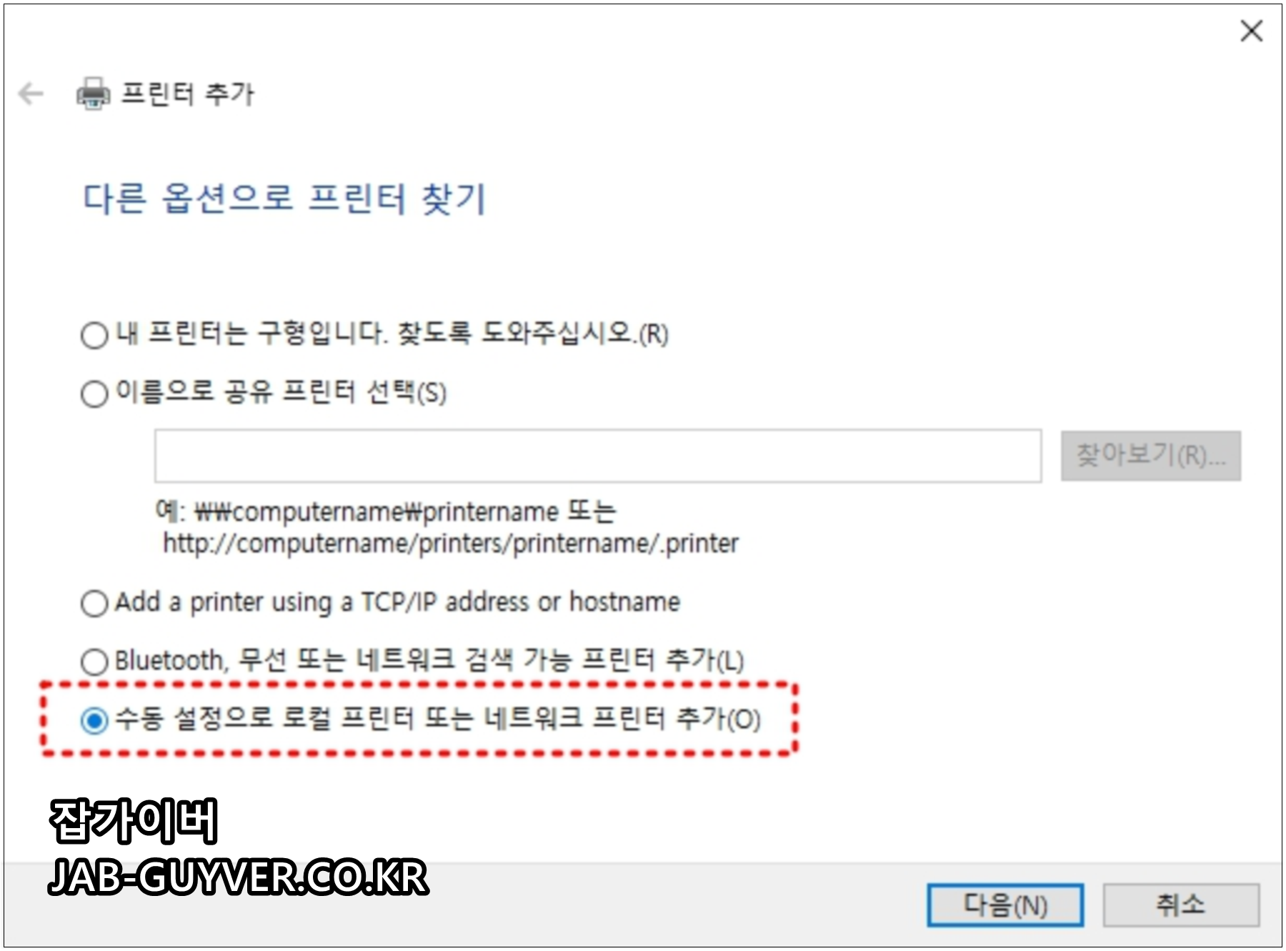 저는 프린터 IP주소를 수동으로 등록하기 위해 수동 설정으로 로컬 프린터 또는 네트워크 프린터 추가를 선택합니다.