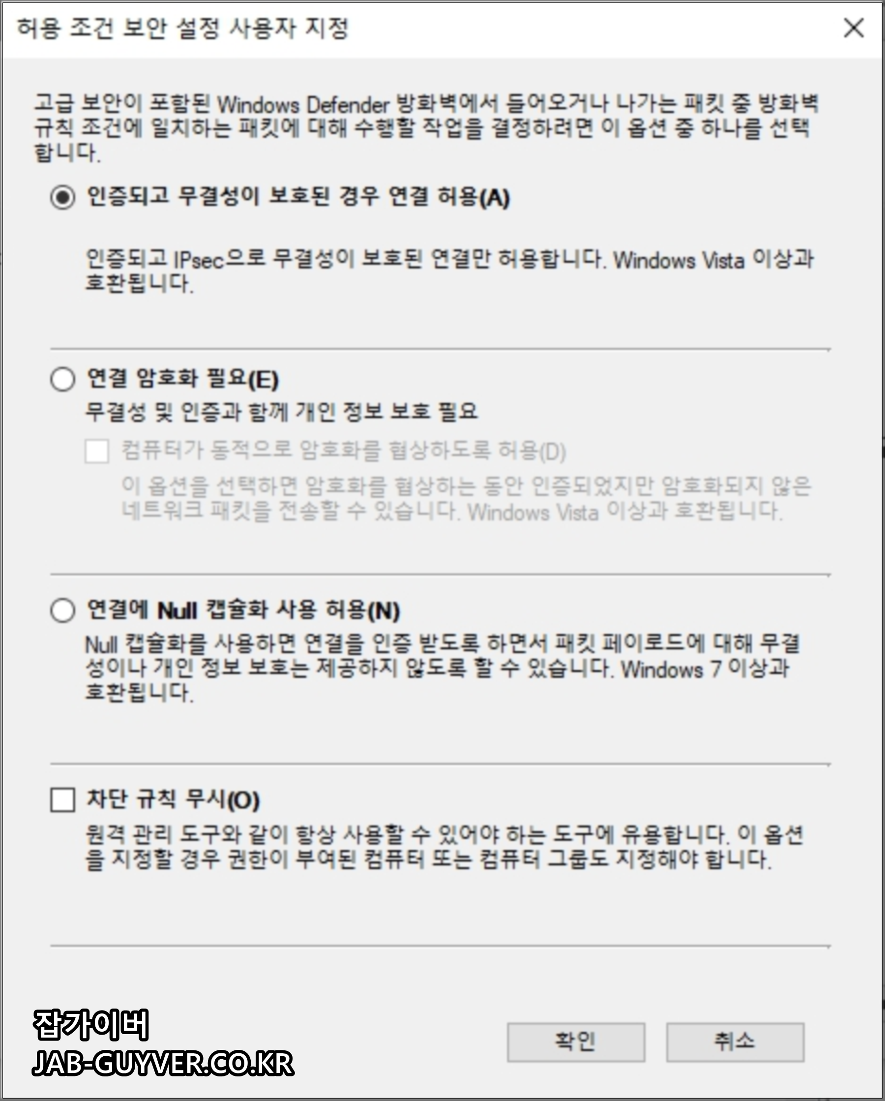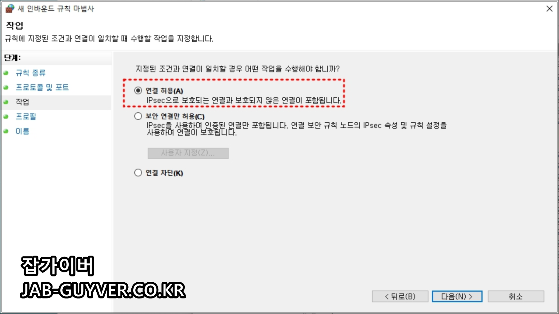 일반 사용자라면 보통 “연결 허용”으로 충분하고, 필요할 때만 보안 연결 규칙을 건드리는 편이 안전합니다.