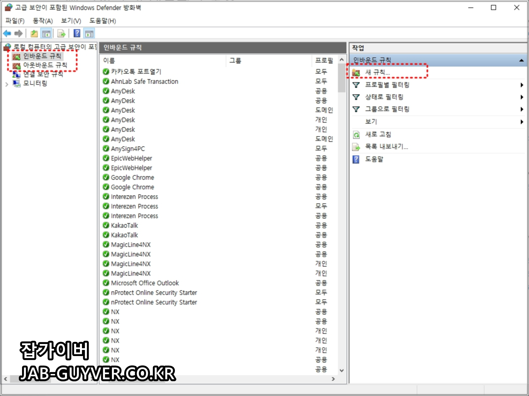 방화벽 고급설정으로 들어가면 인바운드 규칙과 아웃바운드 규칙을 각각 추가할 수 있습니다.