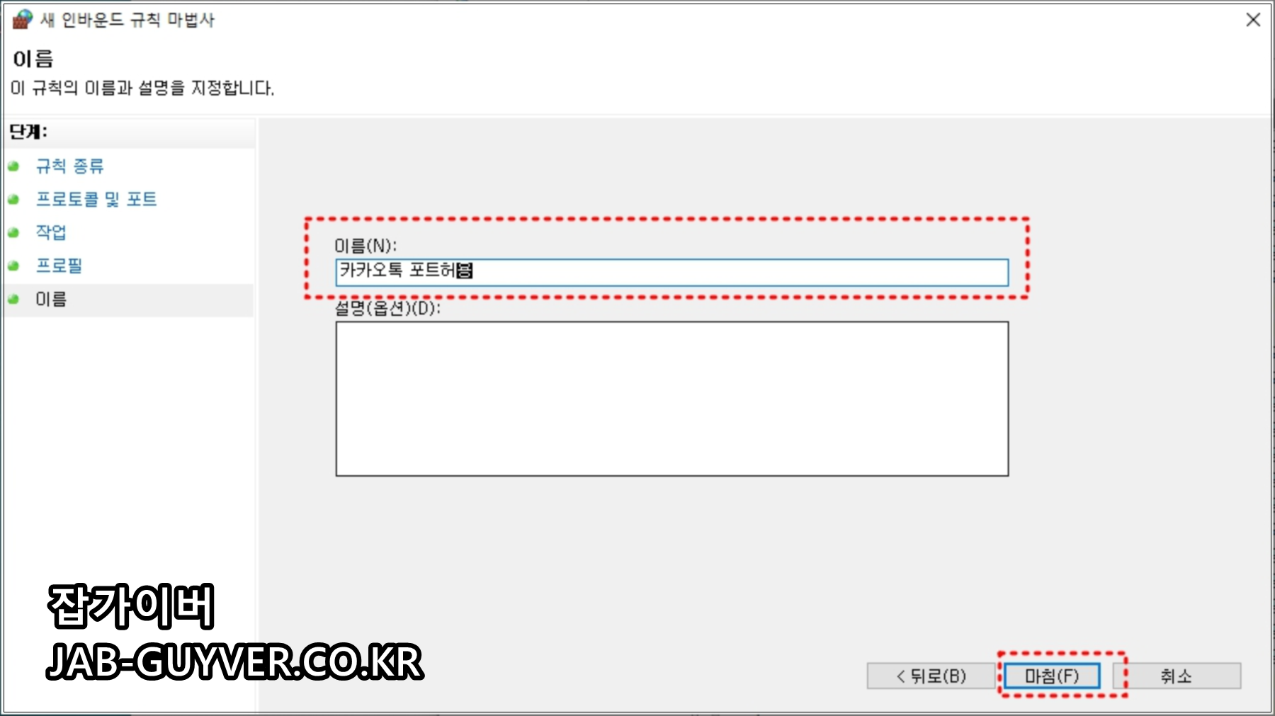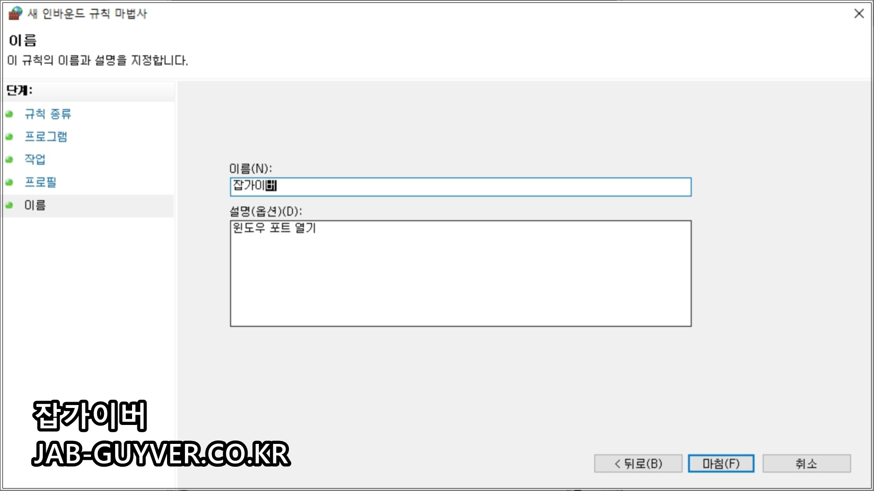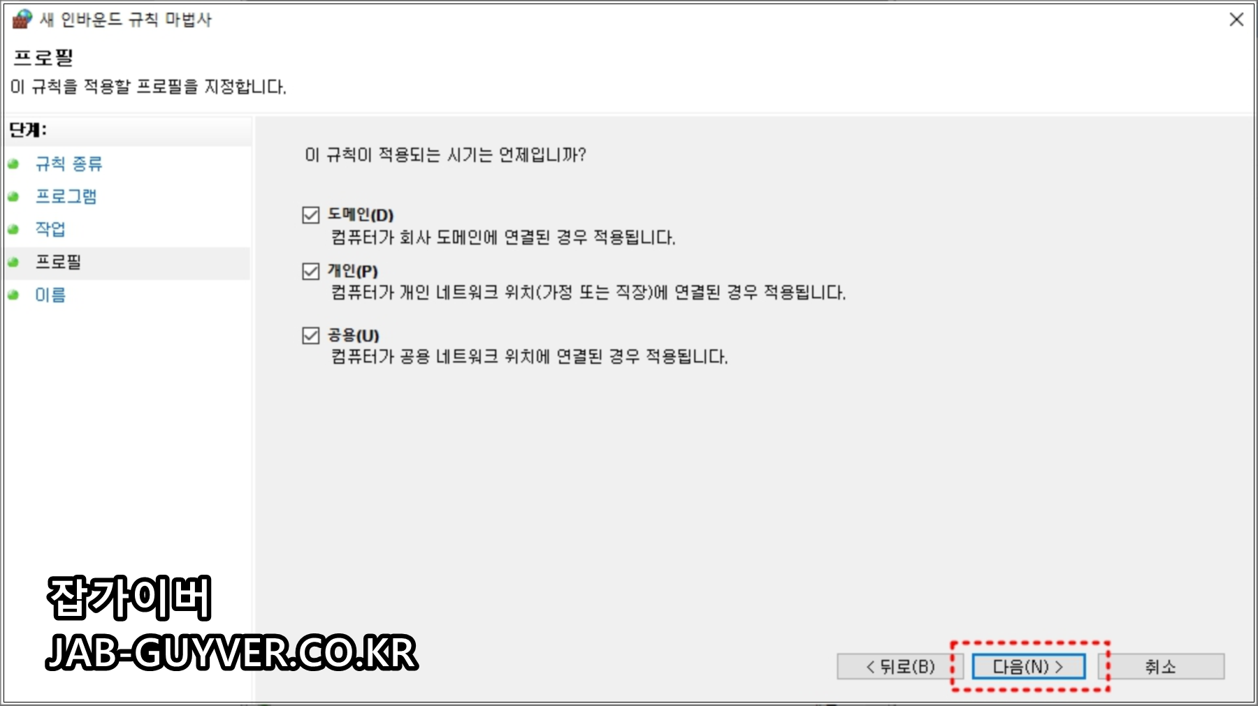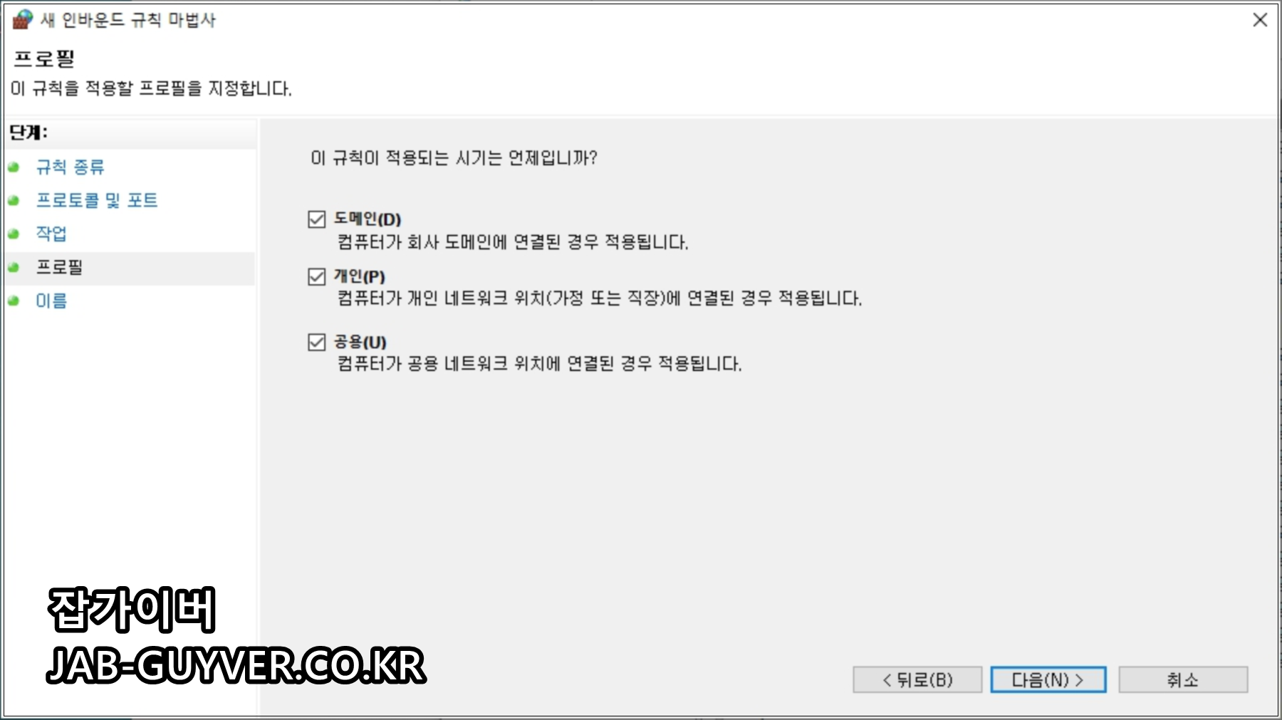 마지막 단계에서 적용 범위(도메인/개인/공용)를 선택하고, 규칙 이름을 알아보기 쉽게 지정하면 관리가 편해집니다.