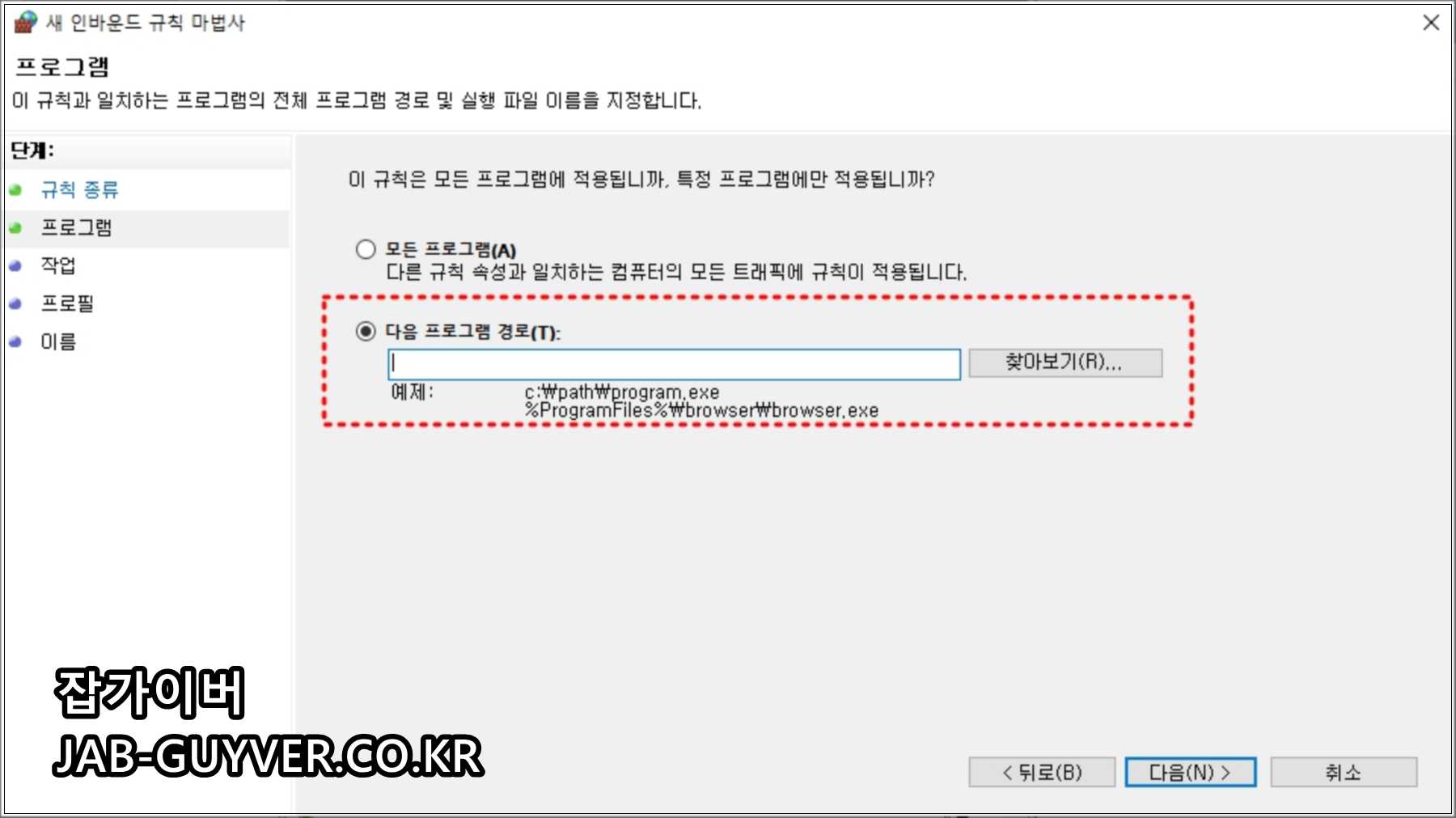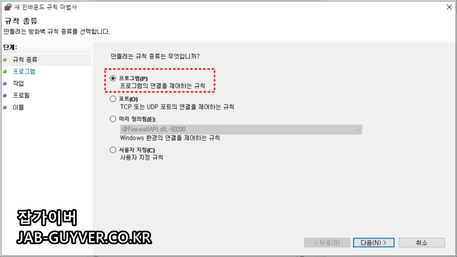 첫 번째는 특정 프로그램(.exe)을 허용하는 방식이고, 두 번째는 특정 포트(TCP/UDP 번호)를 규칙으로 열어주는 방식입니다.