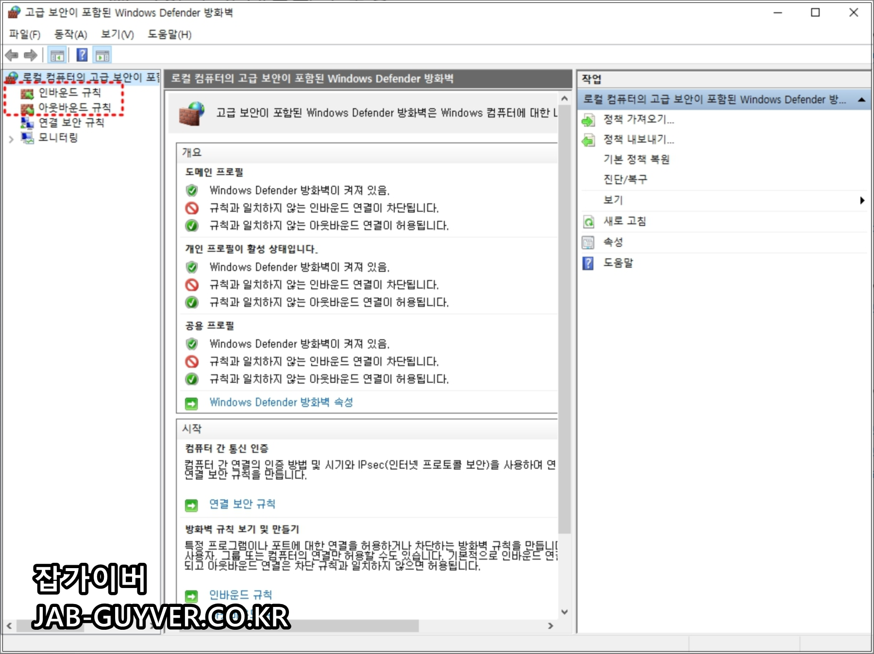 방화벽 고급설정으로 들어가면 인바운드 규칙과 아웃바운드 규칙을 각각 추가할 수 있습니다.