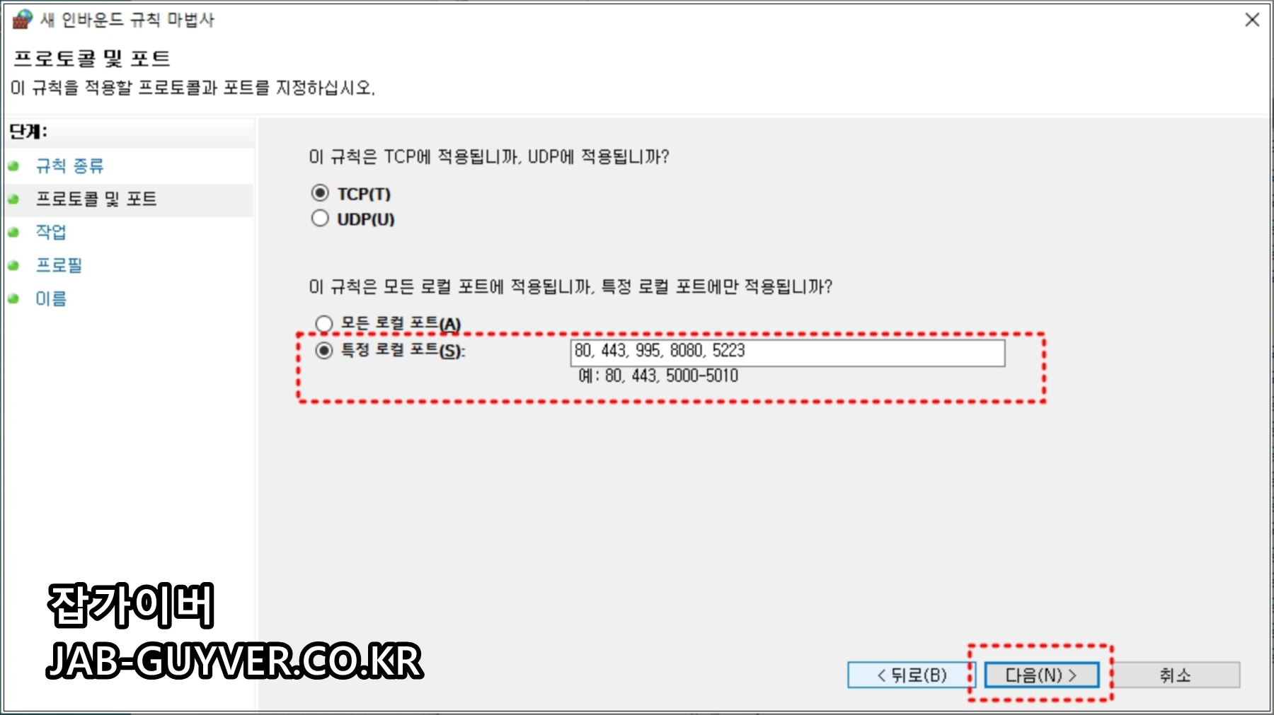 방화벽 고급설정에서 새 규칙을 만들 때 포트를 선택하고, TCP 또는 UDP를 고른 뒤 로컬 포트를 입력하면 됩니다.