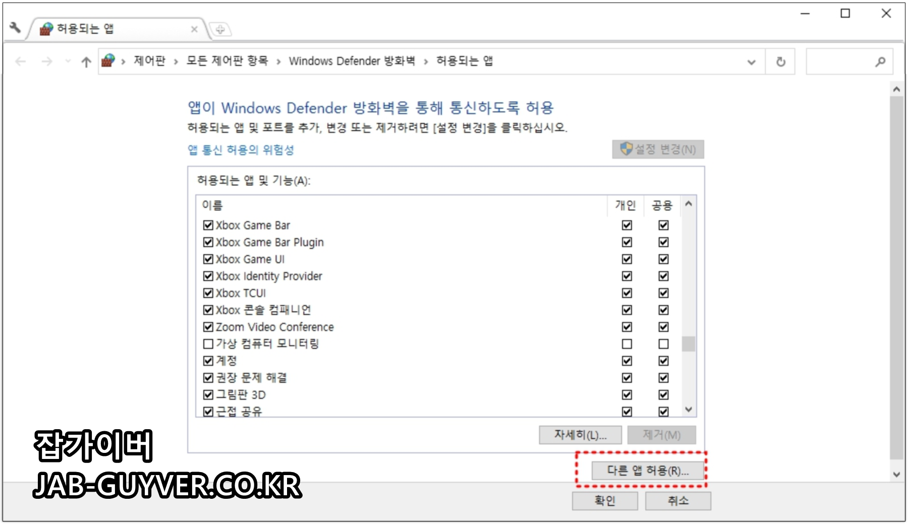 여기서 “앱을 방화벽을 통해 허용” 메뉴로 들어가면, 윈도우 디펜더 방화벽에서 허용되는 앱 목록을 확인하고 추가할 수 있습니다.