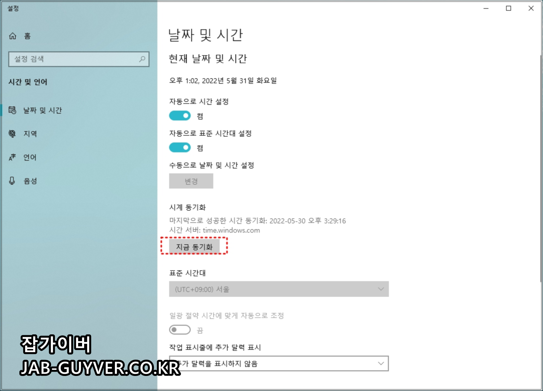 지역 위치값이 대한민국으로 조정하며 시계를 자동으로 동기화합니다.