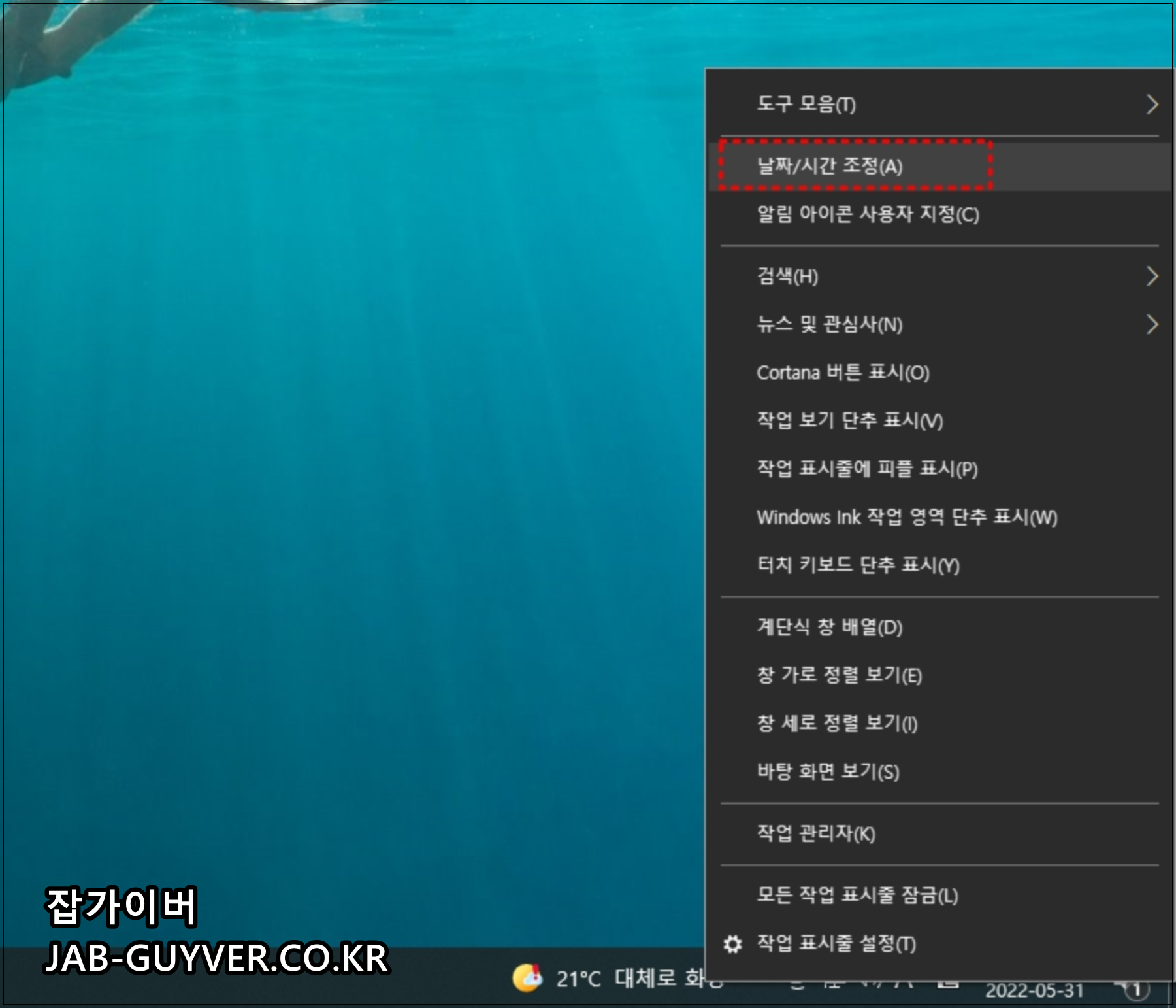 윈도우 모니터 우측하단의 날짜 및 시간을 확인 후 맞지 않는다면 설정변경을 진행합니다.