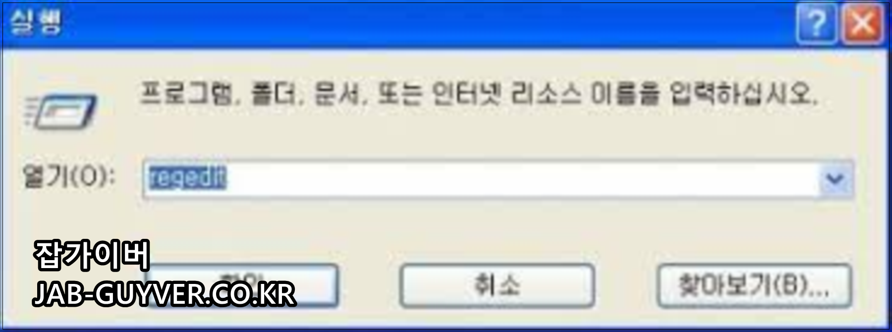 시작 -> 실행에서 regedit 입력 후 확인을 눌러 “레지스트리 편집모드“실행합니다.