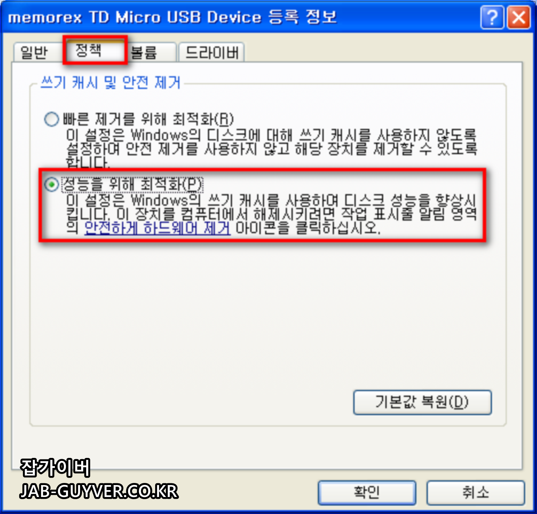 이를 통해 USB 제거 시 안전제거를 통해 USB를 제거하는 옵션이 활성화됩니다.