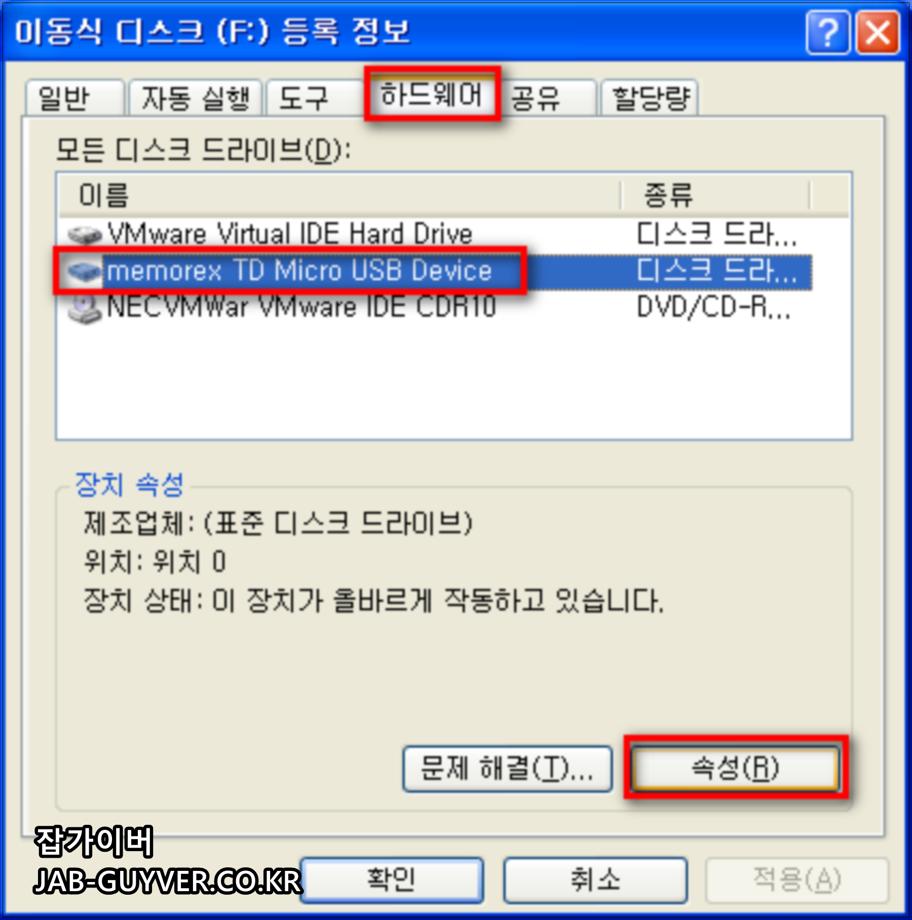 - 하드웨어 -> 모든 디스크 드라이브에서 삽입된 USB 드라이브를 선택 후 속성으로 들어갑니다.