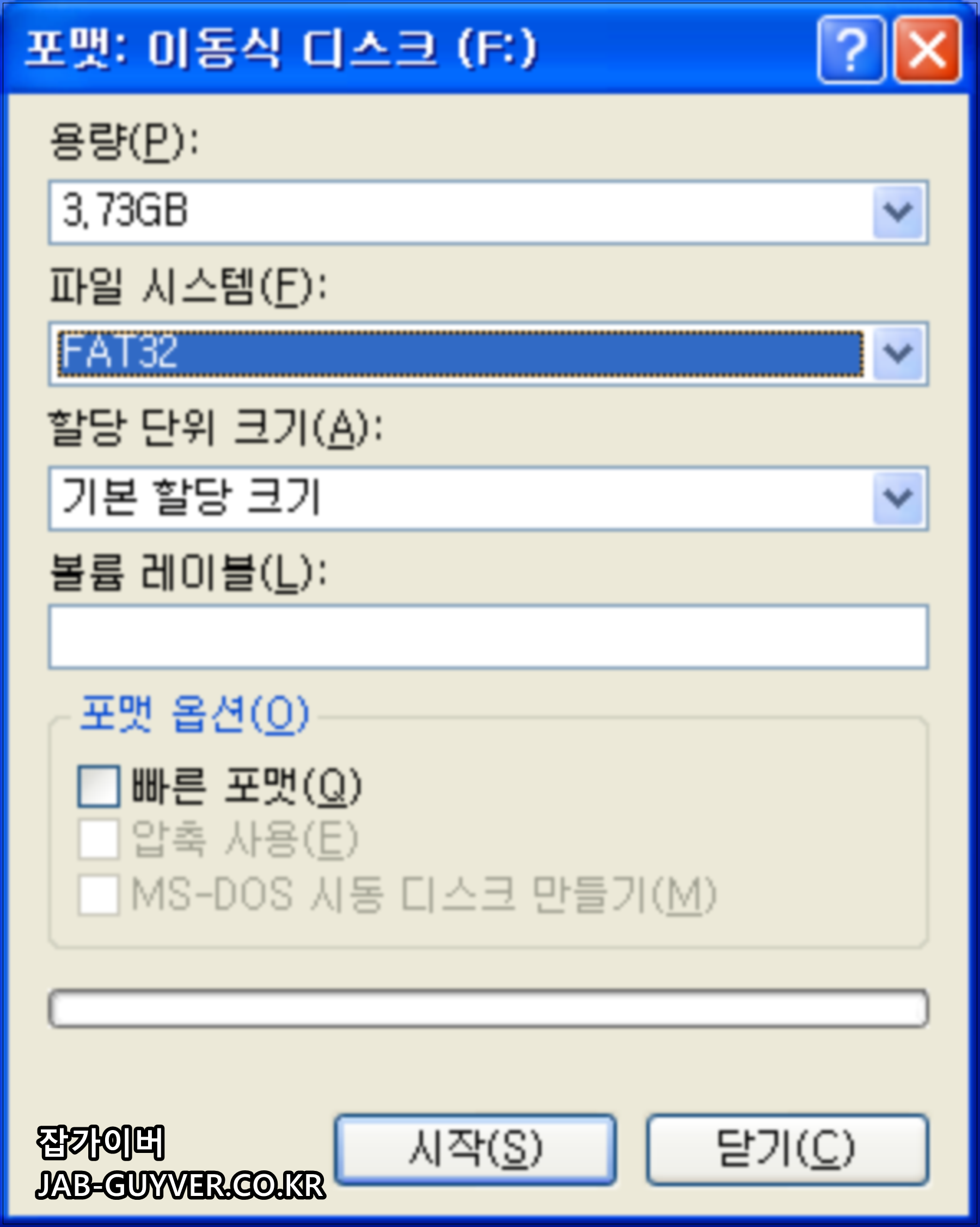 다시 포맷창으로 들어가면 파일 시스템에서 FAT32 외에도 NTFS 포맷을 선택할 수 있습니다.