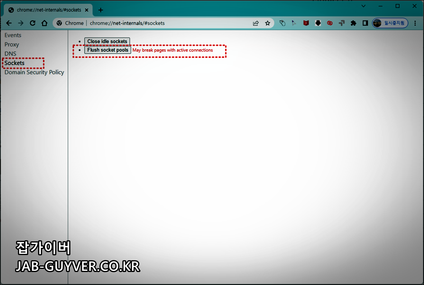 - chrome://net-internals/#sockets에서 소켓 캐시를 지우면 연결 문제가 해결될 수 있습니다.