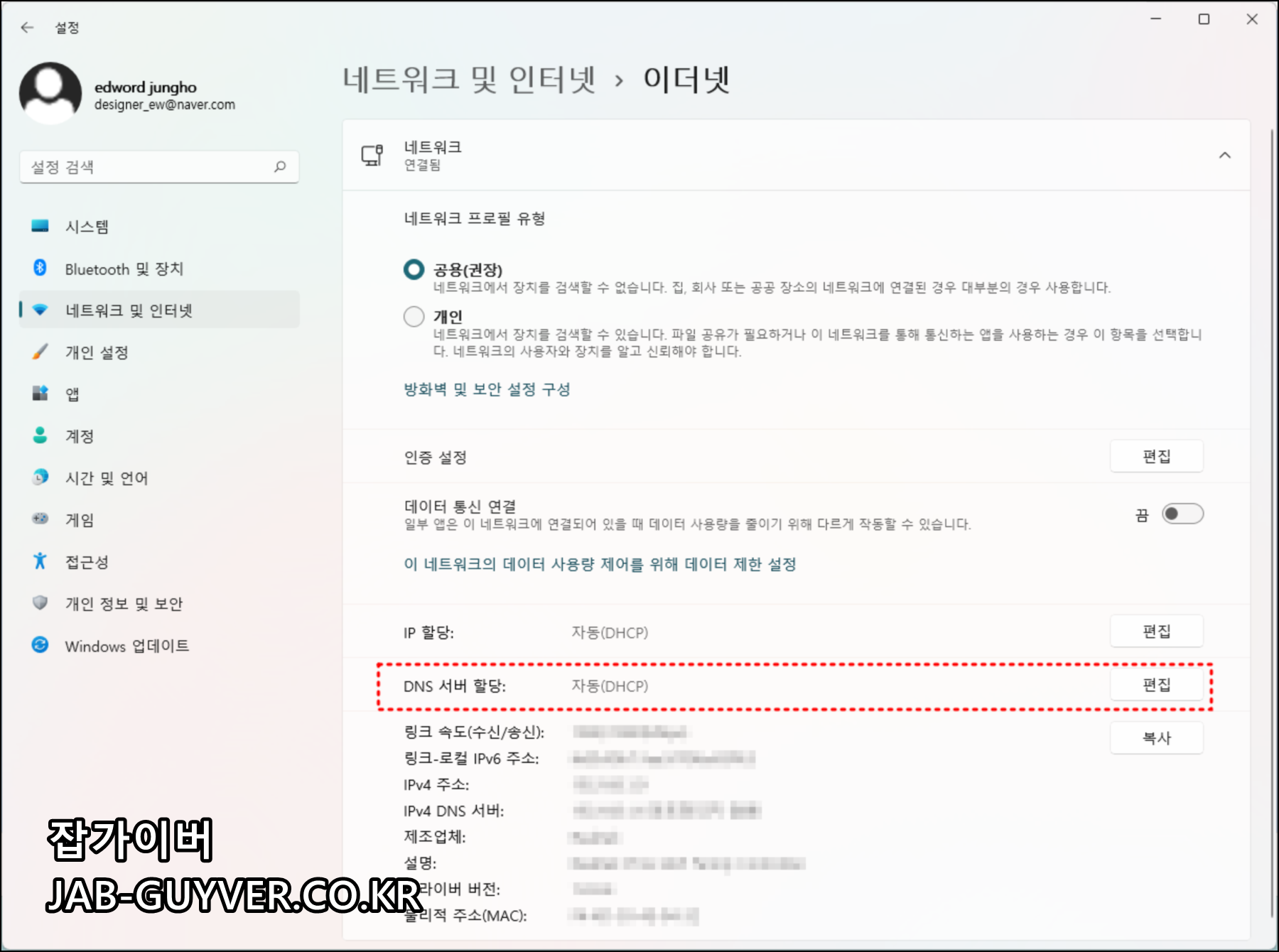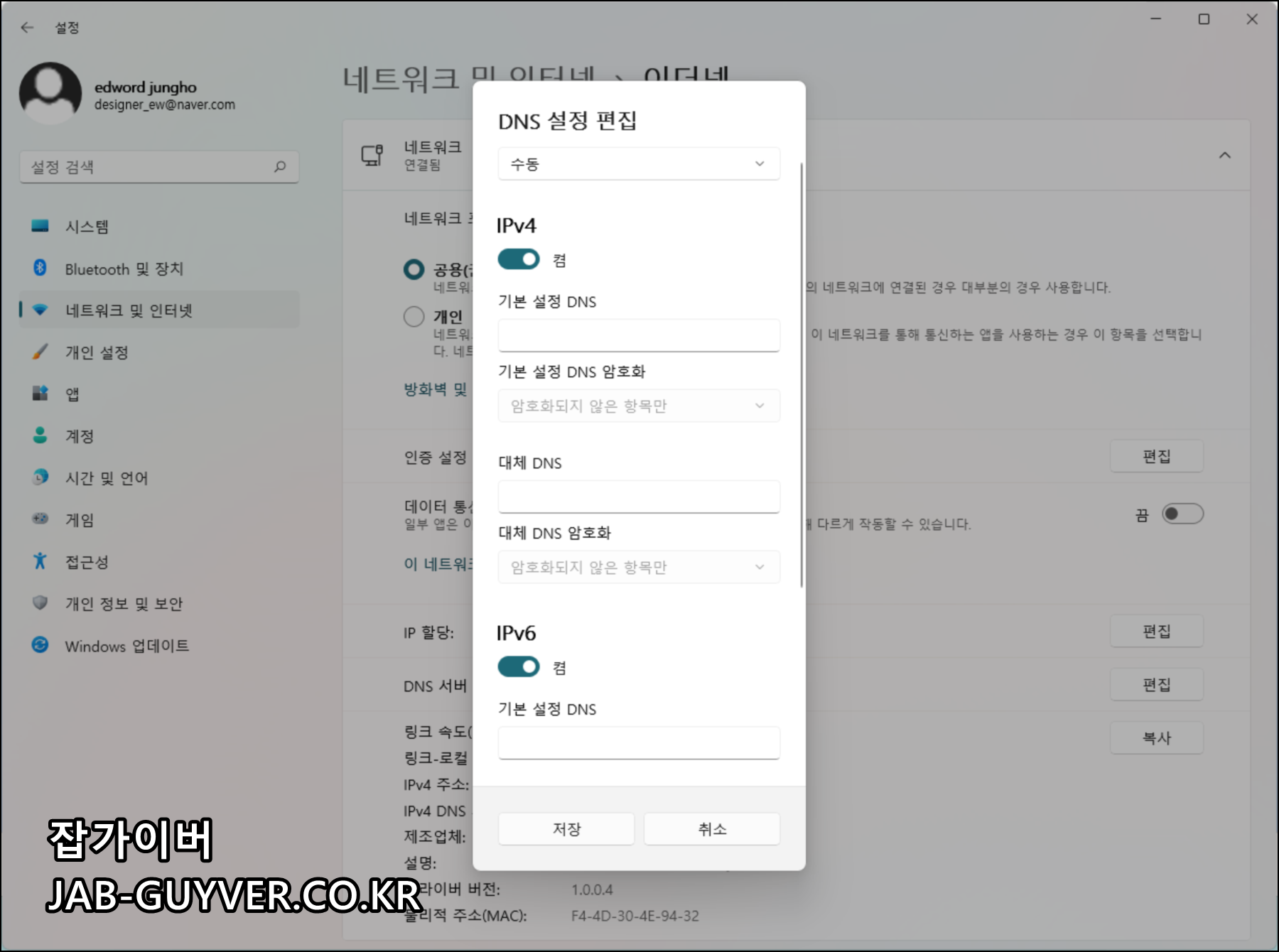 윈도우11 DNS IPv4 및 IPv6 주소