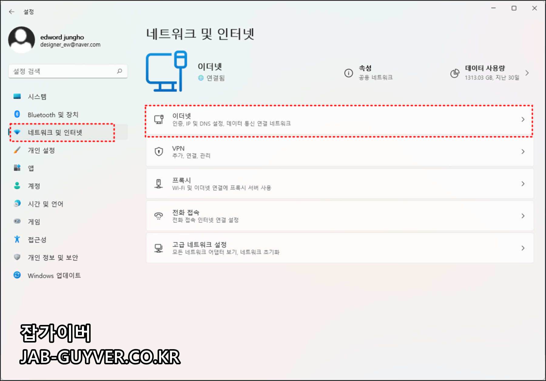 네트워크 및 인터넷 -> 이더넷 (인증 및 IP 주소, DNS 설정, 데이터통신 및 연결 네트워크 설정)을 선택합니다.
