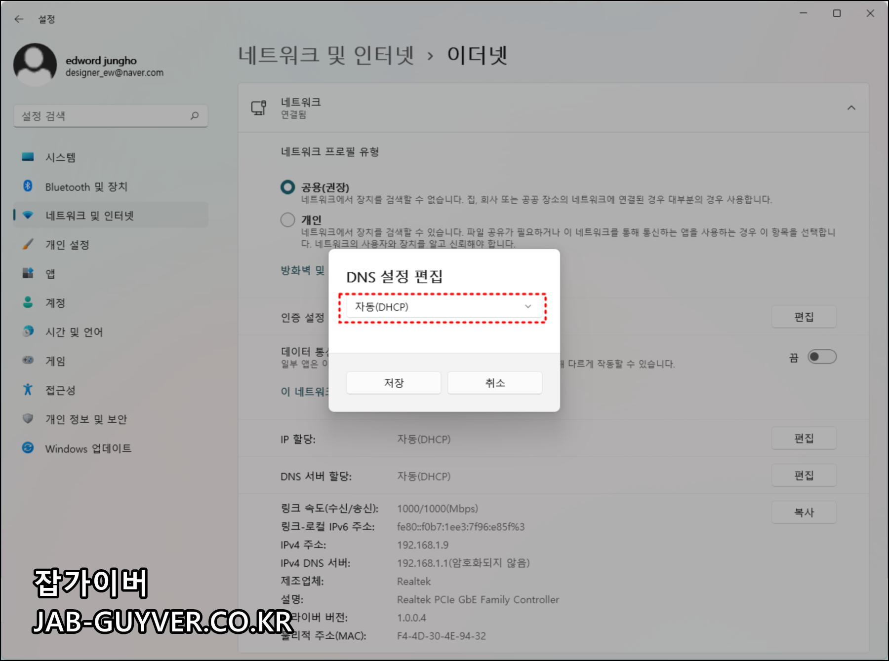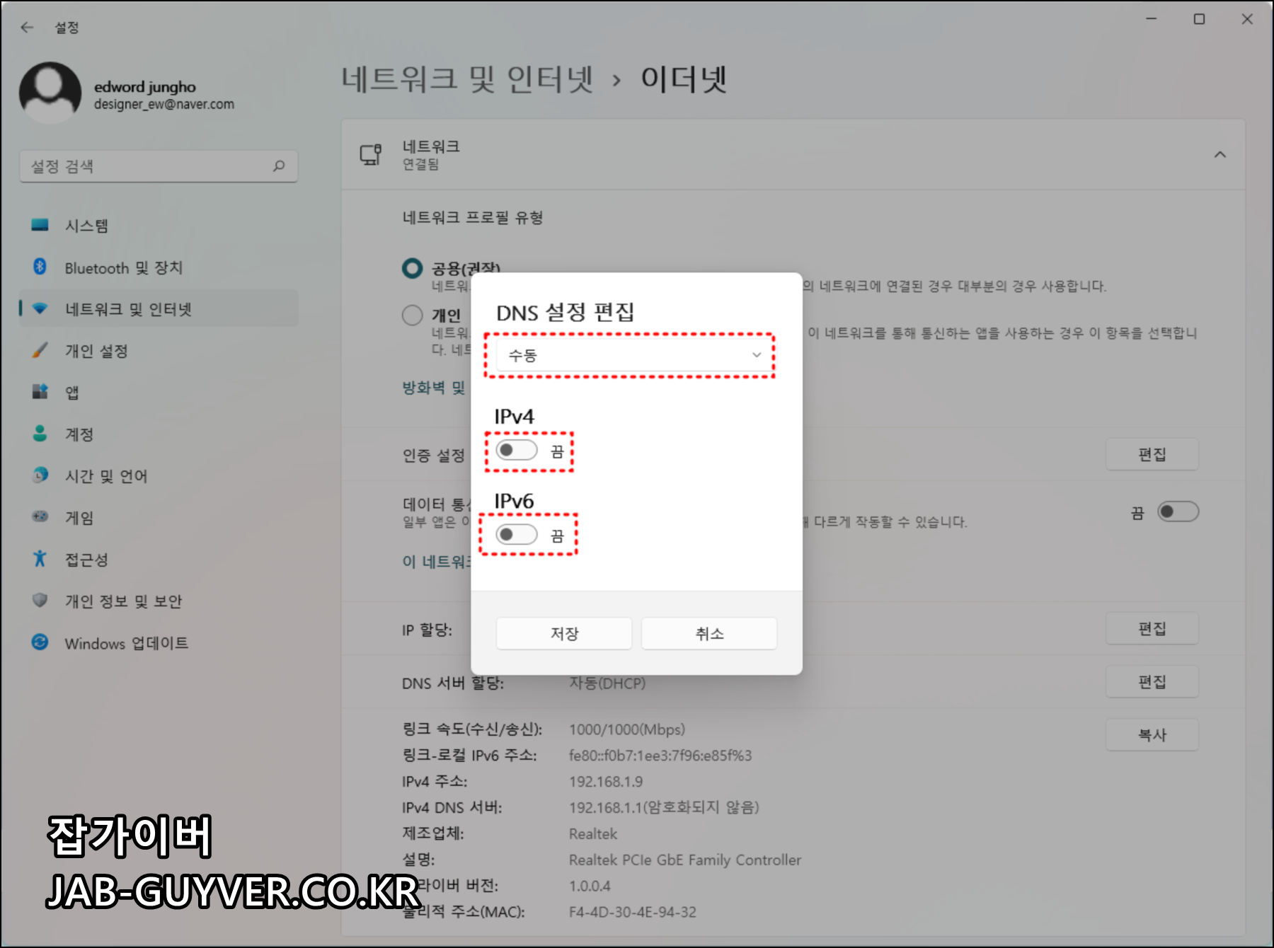 윈도우11 DNS IPv4 및 IPv6 주소