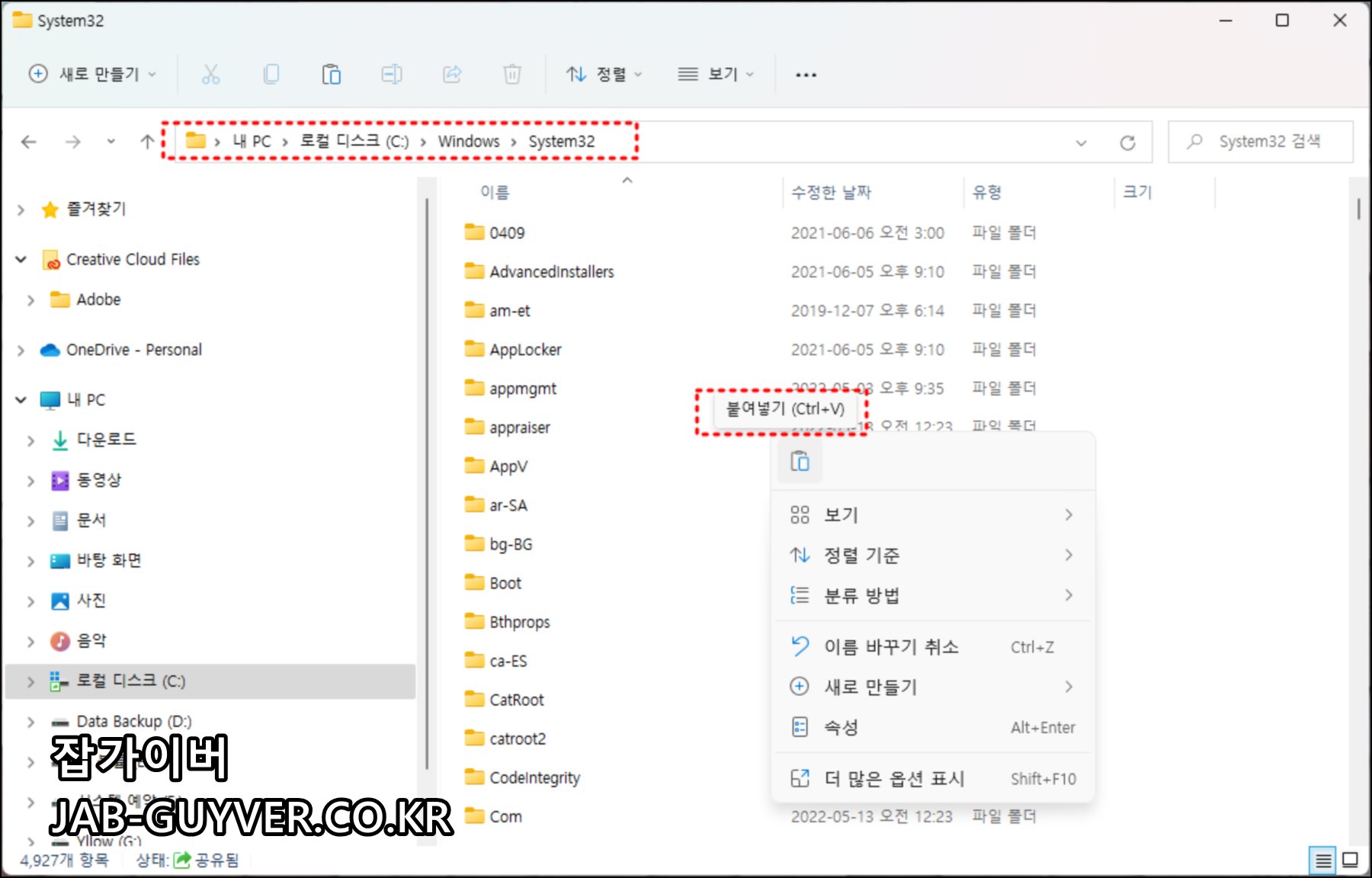 C:\Windows\System32 폴더로 이동 해서 아까 복사한 배치파일을 붙여넣기합니다.