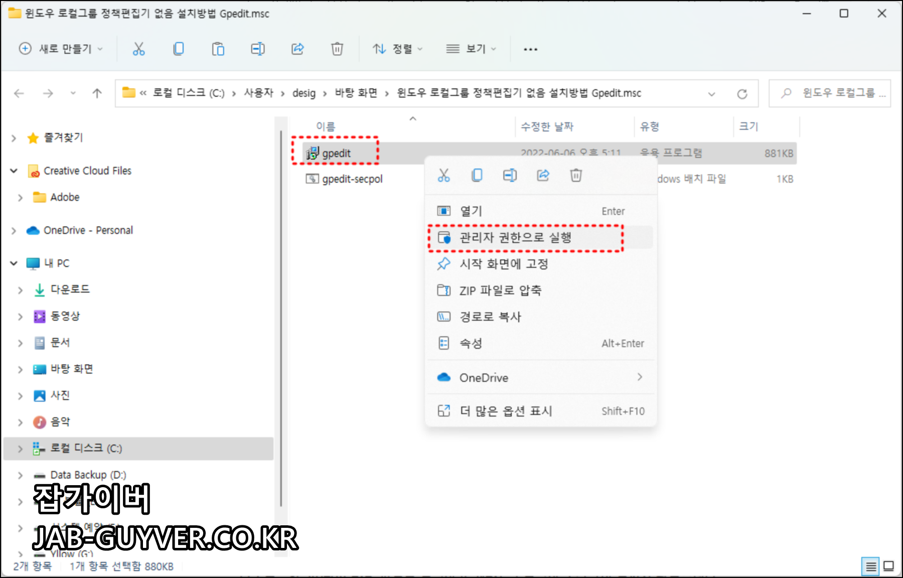 해결 방법 : gpedit.bat 파일을 마우스 우클릭 → ‘관리자 권한으로 실행’ 선택