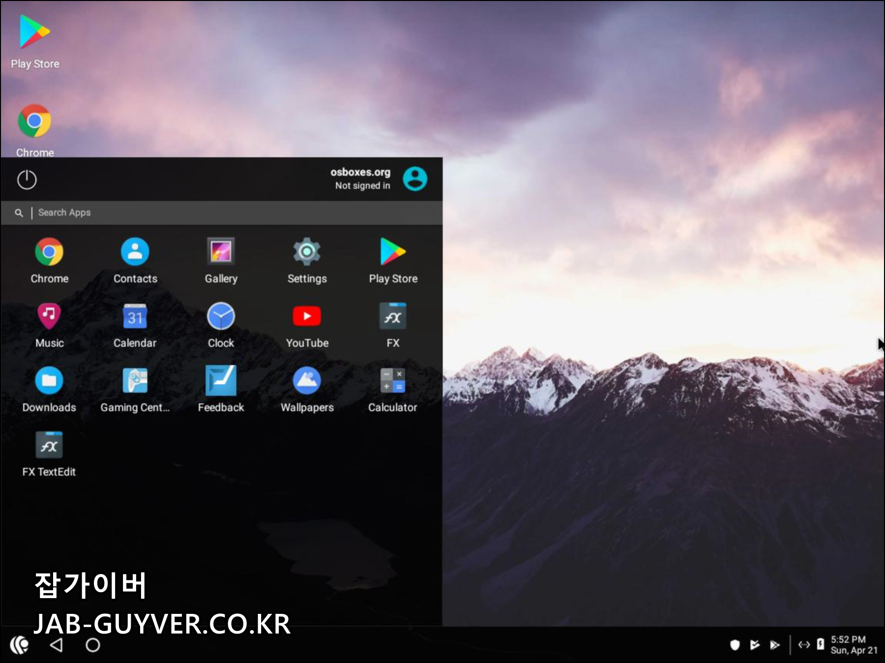 이후 부팅 된 뒤 Play Stroe 앱을 실행할 수 있으며 안드로이드 앱을 설치할 수 있게 됩니다.