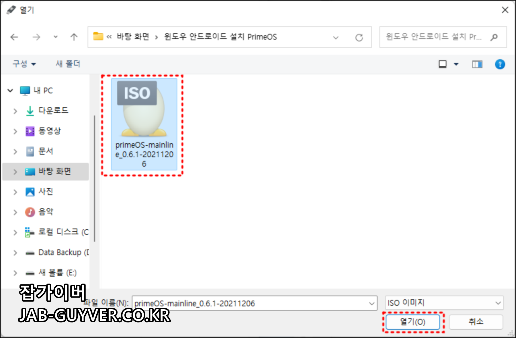 다운로드 한 "primeOS-mainline_0.6.1-20211206.ISO"파일을 선택합니다.