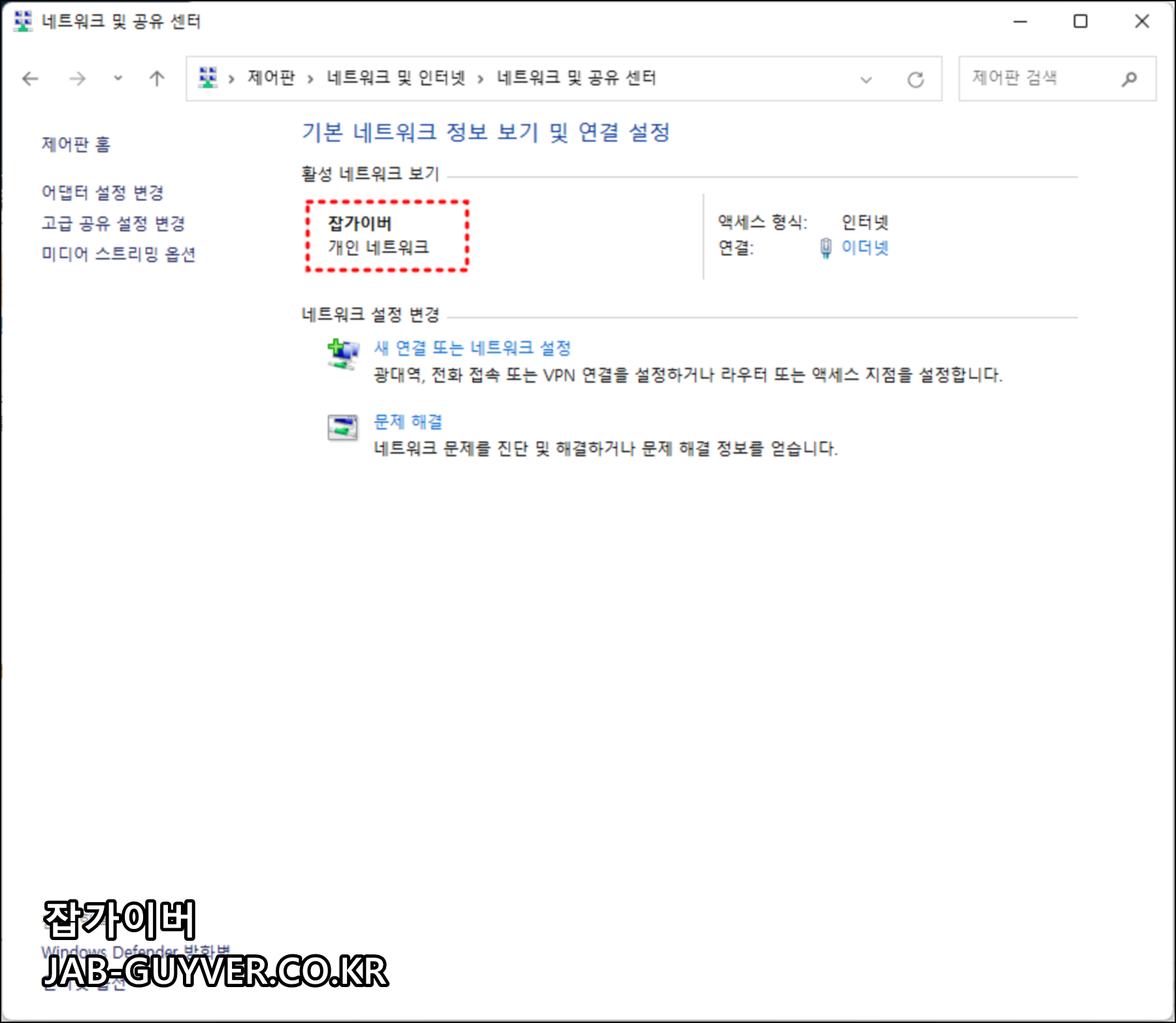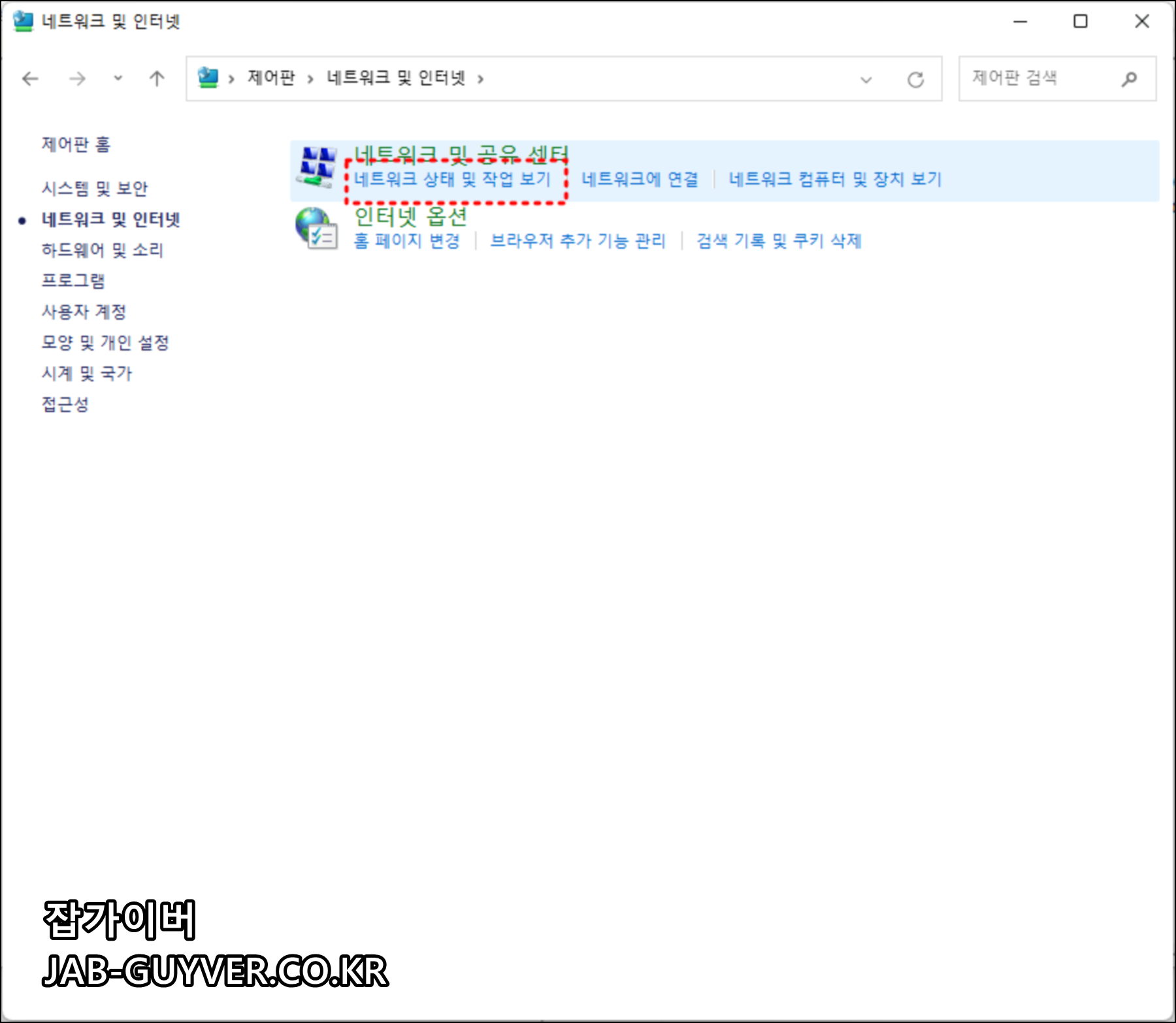 윈도우 제어판 -> 네트워크 및 인터넷 -> 네트워크 및 공유센터 -> 네트워크 상태 및 작업보기를 선택합니다.