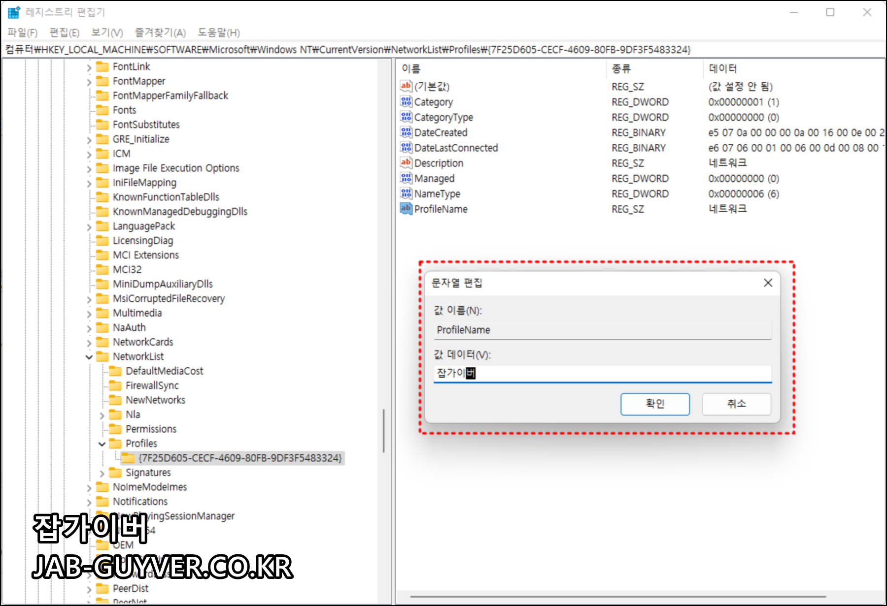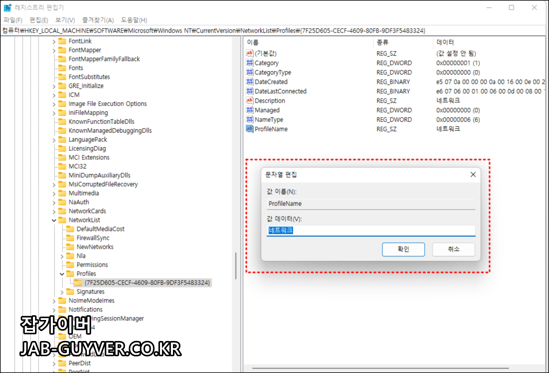 레지스트리 편집기에서 아래 경로로 이동 하면 프로필에서 프로필 이름을 통해 현재 네트워크 이름 "GUID (Global Unique Identifier) 번호를 확인할 수 있습니다.