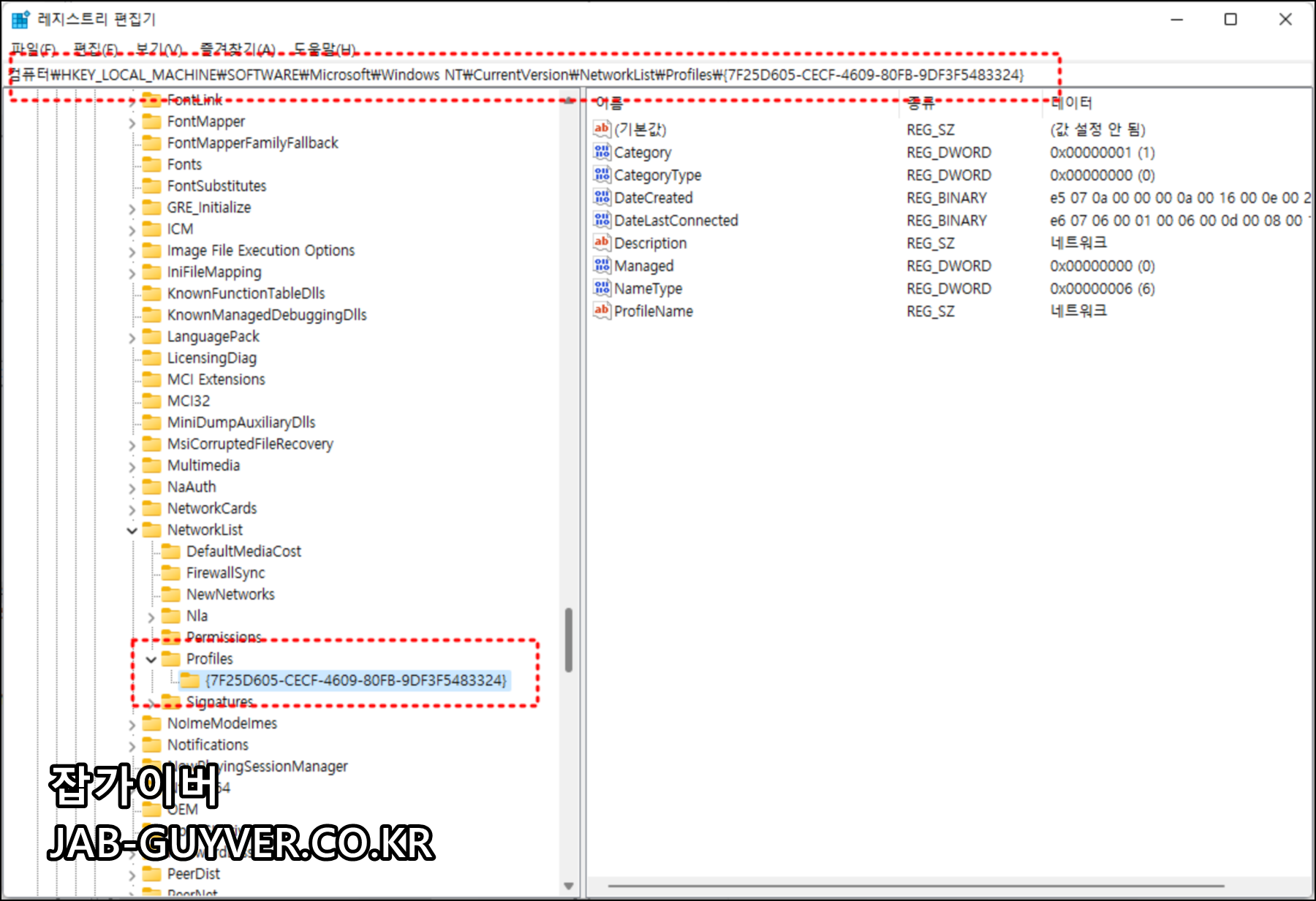 레지스트리 편집기에서 아래 경로로 이동 하면 프로필에서 프로필 이름을 통해 현재 네트워크 이름 "GUID (Global Unique Identifier) 번호를 확인할 수 있습니다.