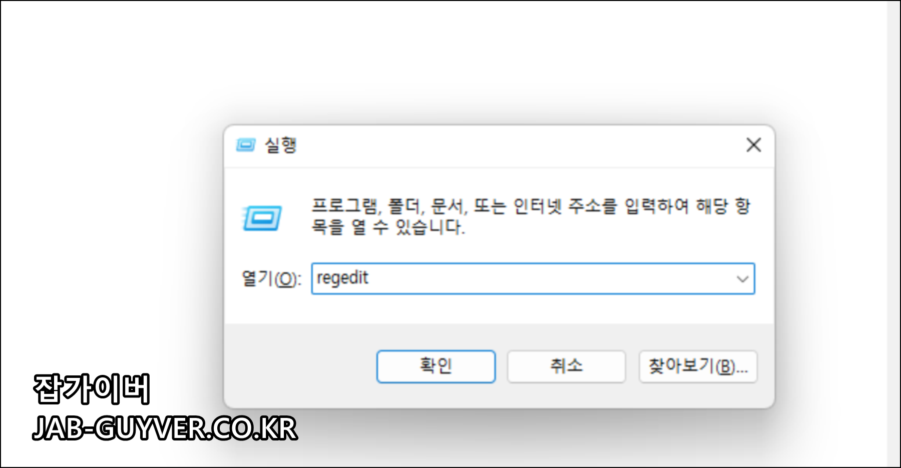 윈도우키 + R을 눌러 실행 창에 "Regedit" 입력 후 확인을 눌러줍니다.