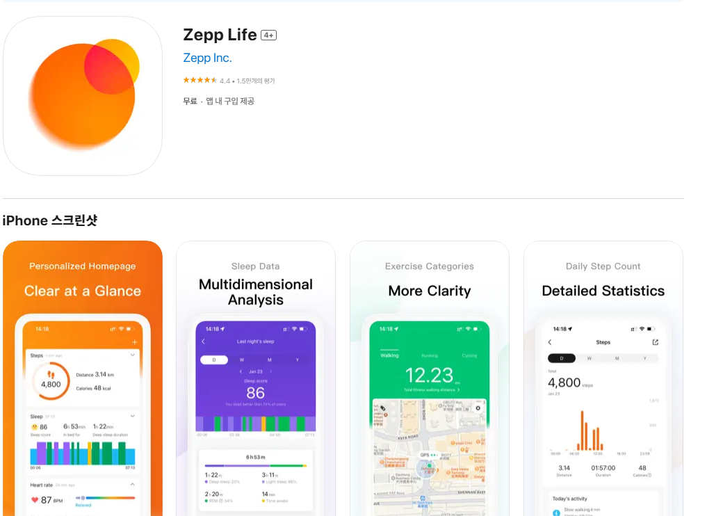 | Apple Health | 가능 ✅ | iOS Zepp Life 앱에서 연동 설정 시 자동 연동 (걸음 수, 수면 등) |
