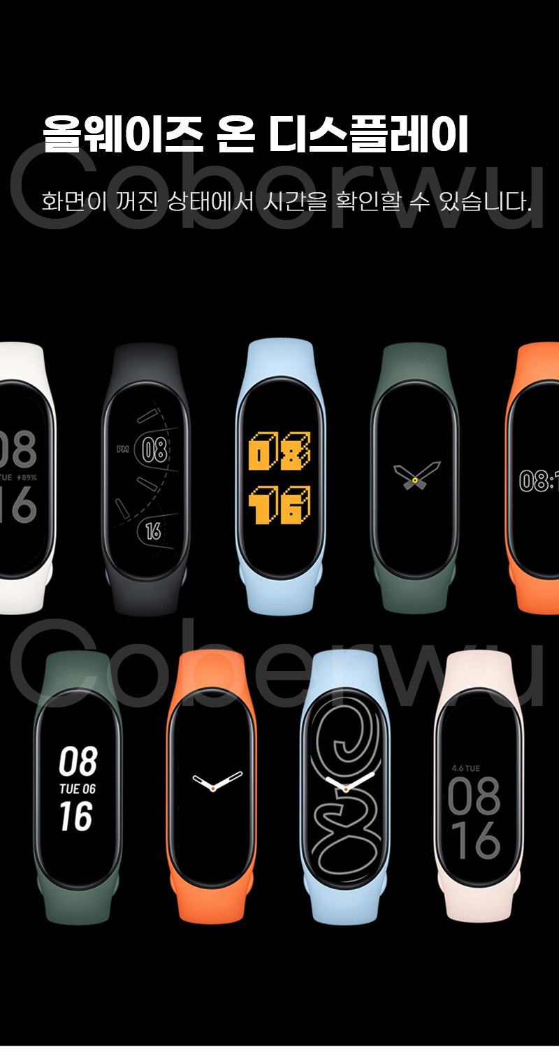 그 외에도 미밴드7에는 AOD 기능을 최초로 탑재되는데 AOD는 Always On Display의 약자로 말 그대로 디스플레이가 항상 켜져있는 저전력 모드를 의미하며 워치화면을 깨우지 않아도 시간 등을 확인할 수 있어 스마트밴드 같은 디바이스에는 매우 유용한 기능이라 할 수 있습니다.
