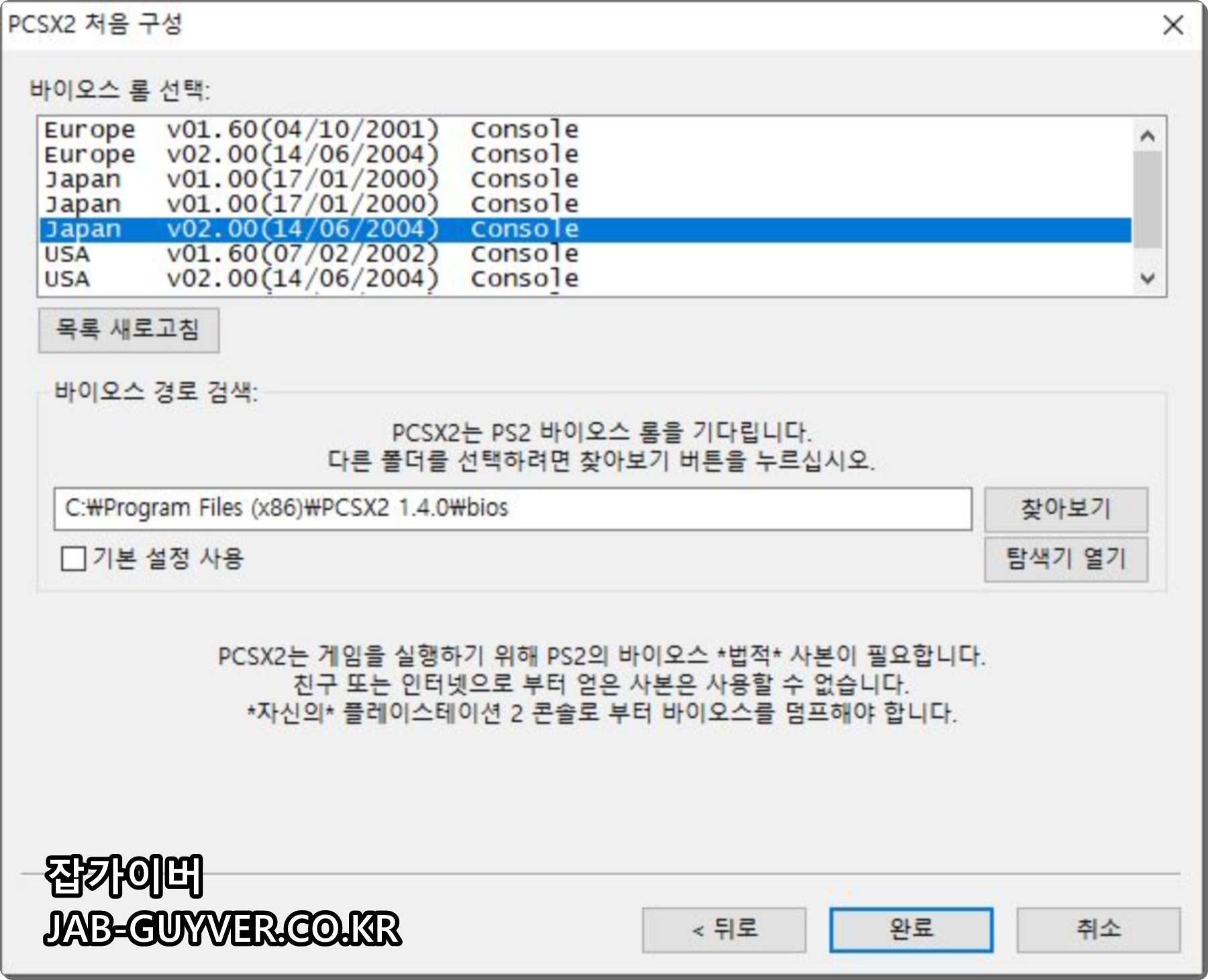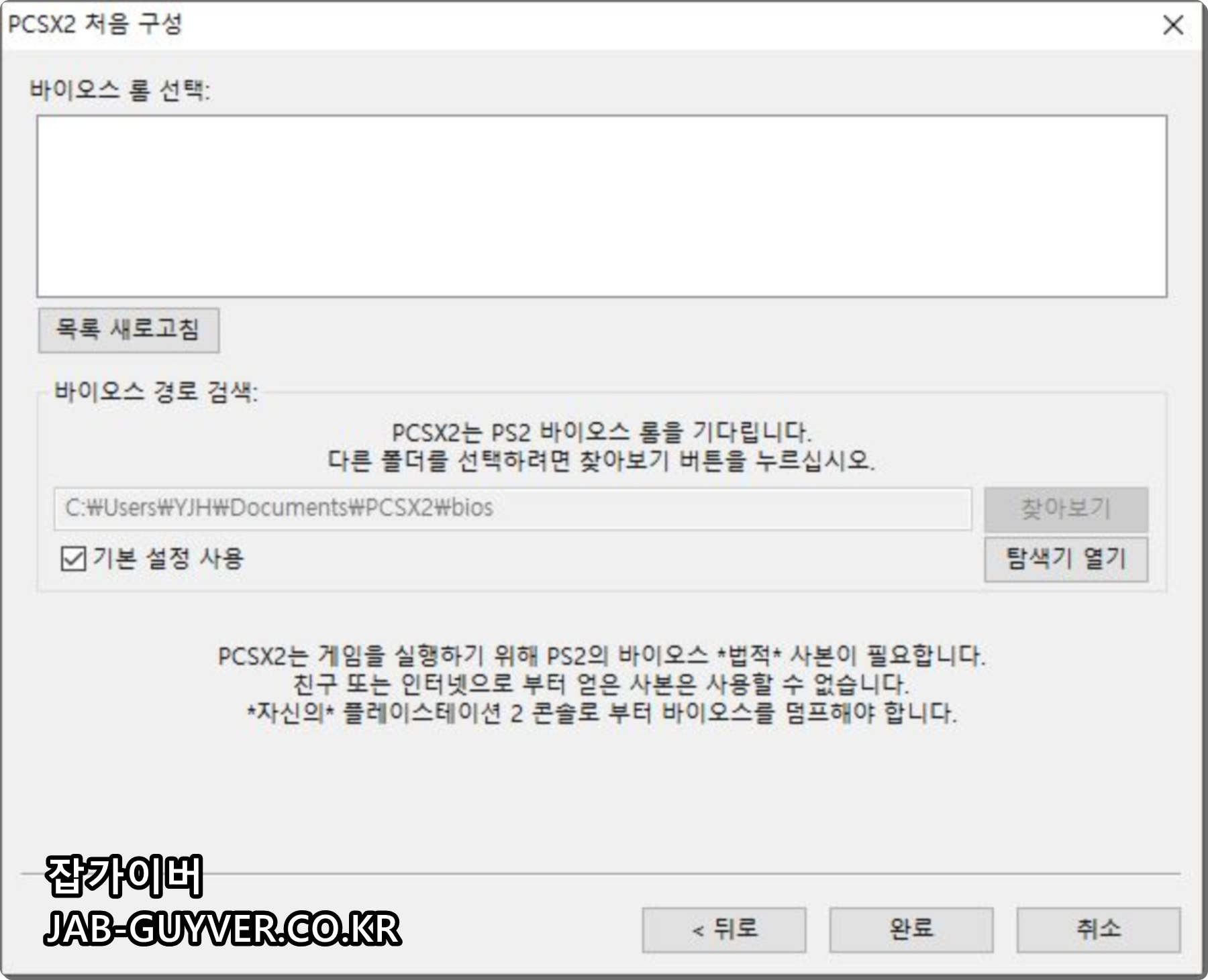 바이오스 기본 설정 경로보다는 PCSX2 설치 폴더 경로로 가서 임의의 'bios' 폴더를 만드는 것이 좋습니다. 차후 바이오스 관리하기 편합니다.