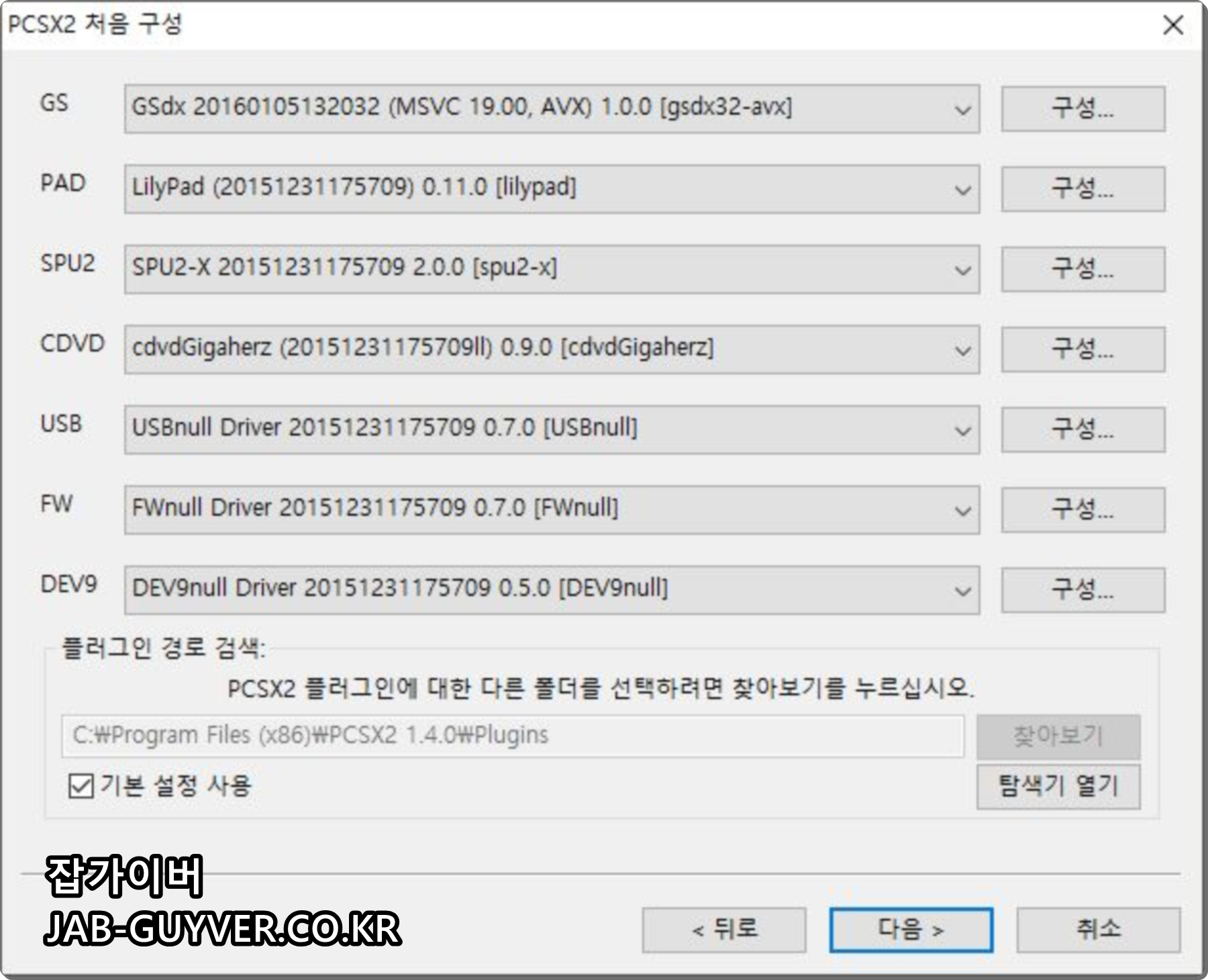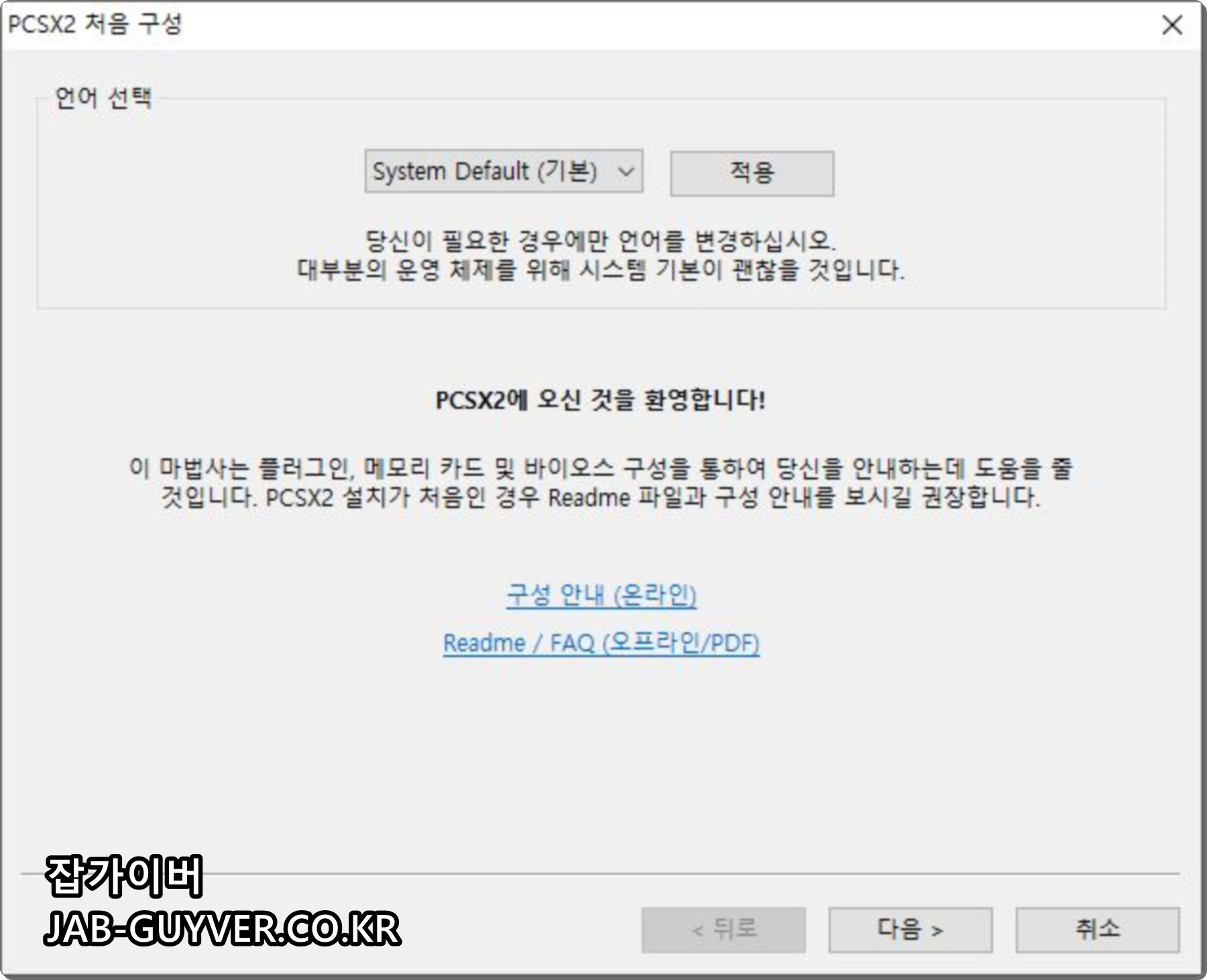 PCSX2 설치 후 실행하면 기본설정을 변경할 수 있으며 별도의 그래픽카드와 게임 바이오스, 게임패드, CD DVD, USB, 플러그인등을 각각 설정할 수 있는데 처음 사용자는 별도의 고급설정을 하지 않고 넘어갑니다.