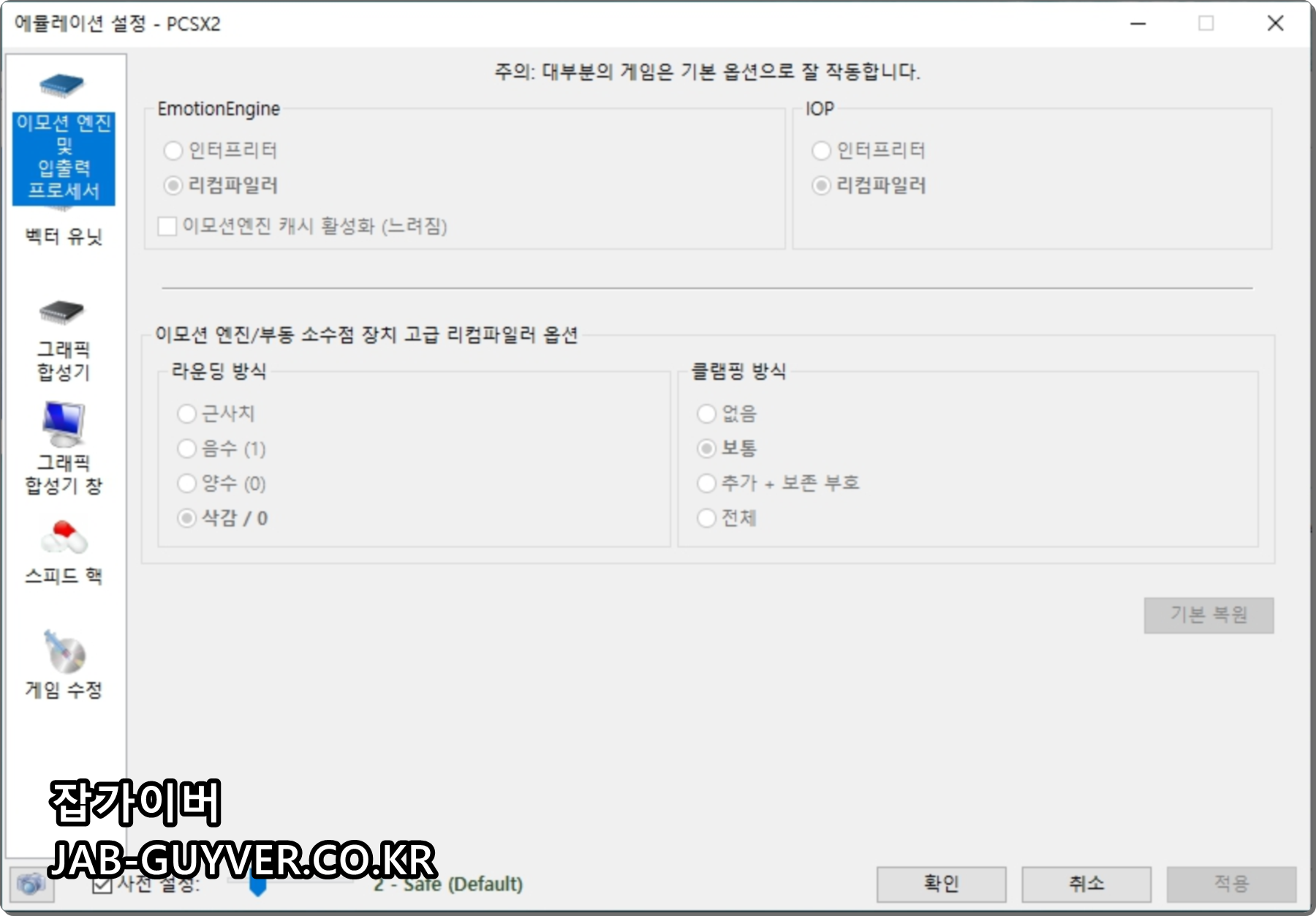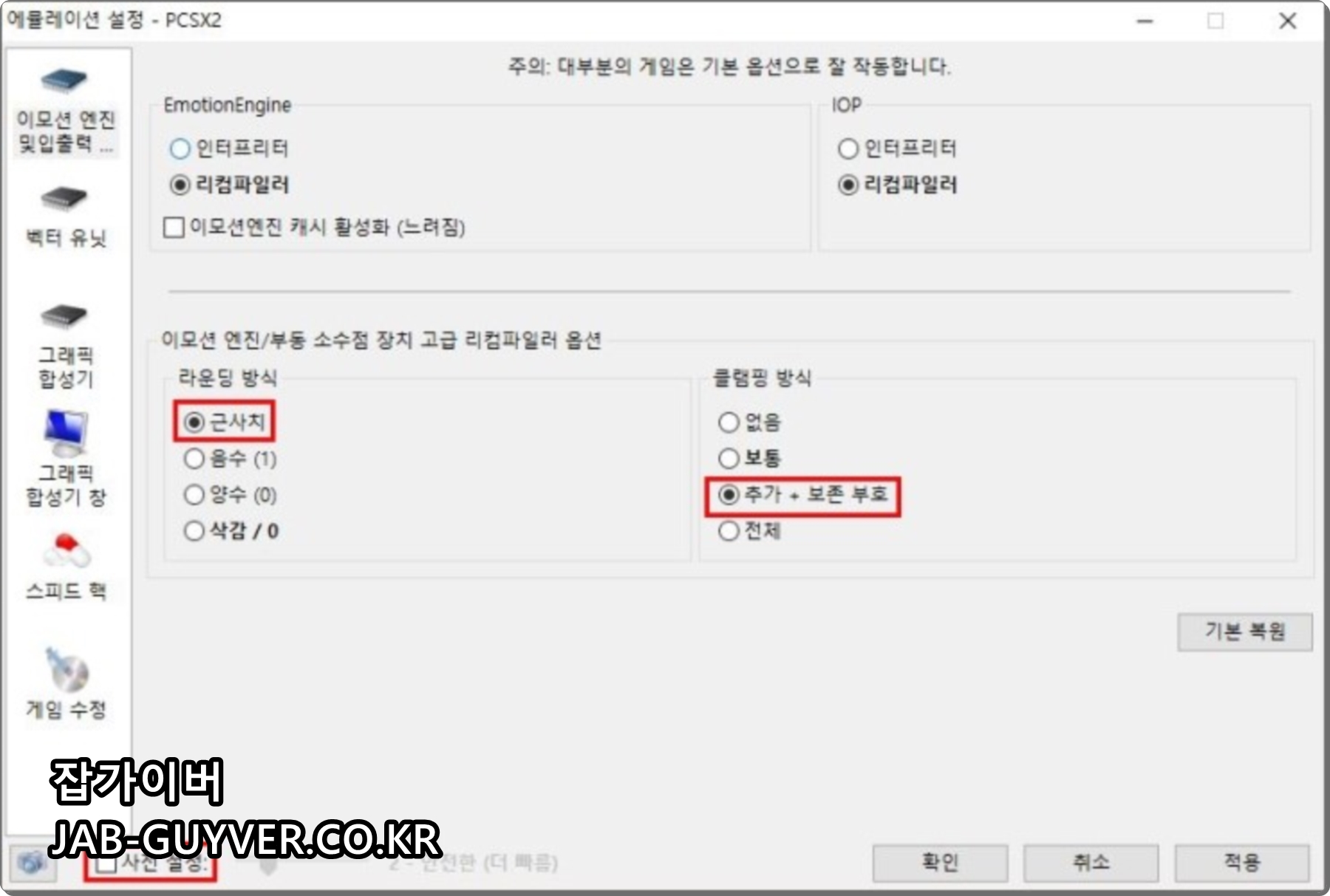 마이크로 벡터 유닛 리컴파일러'는 다른 옵션과 다르게 최신 컴파일러이고 게임과의 호환성이 좋으며 이것도 게임 호환성과 관련되어 있어 기본 설정 그대로 둡니다. '라운딩 방식' 과 '클램핑 방식'은 이모션 엔진/부동 소수점 장치의 연산 속도를 결정합니다.