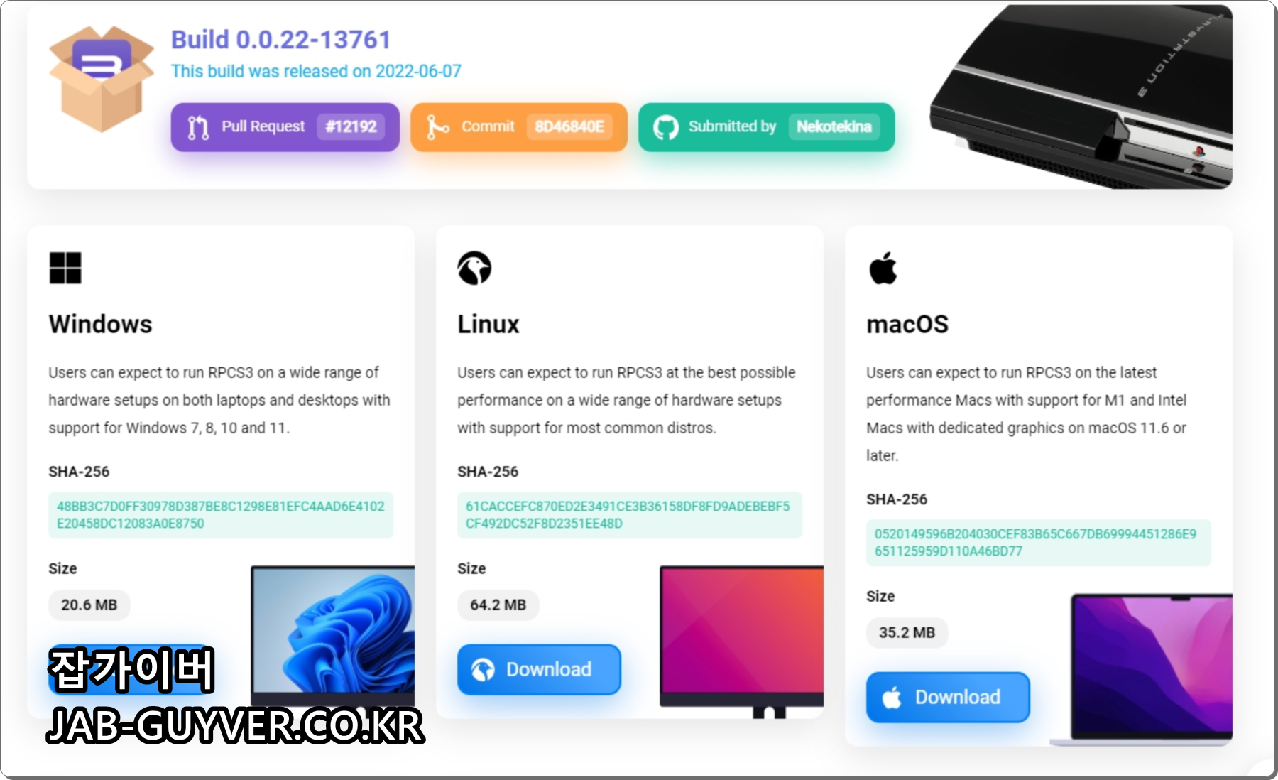 RPCS3 홈페이지에 접속하면 PC 윈도우버전 및 리눅스, 애플 MacOS 버전을 제공합니다.