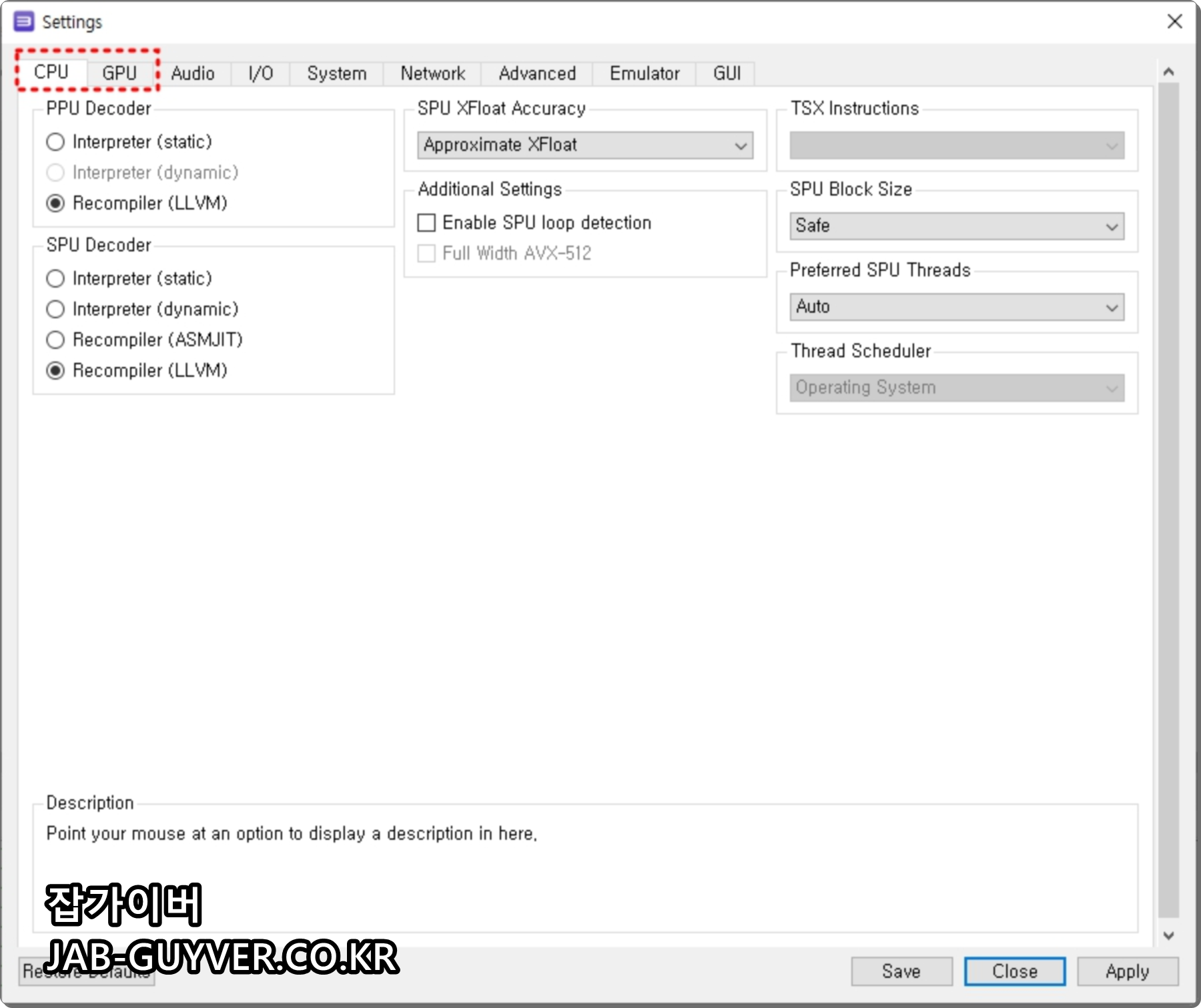 - SPU Decoder : 플스3 게임에 프레임이 더 잘나오길 바란다면 Recompiler (ASMJIT)로 설정하고 일부 PC의 경우 LLBM이 더 잘 나올 수도 있고 ASMJIT이 더 잘 나올 수도 있기 때문에 한번 설정을 바꿔가면서 자신의 컴퓨터 사양에 프레임이 더 잘 돌아가느걸 찾는걸 추천합니다.
