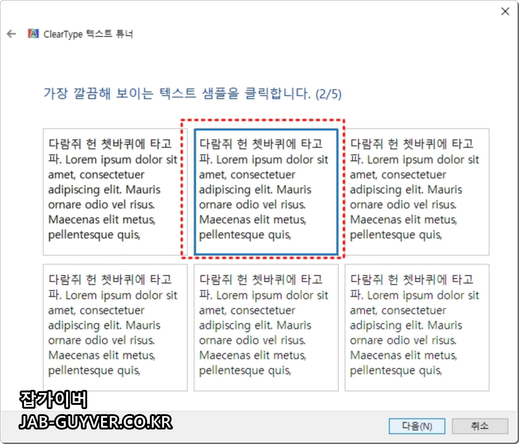모니터 색보정이 완료되면 자동으로 ClearType 텍스트 튜너이 실행되는데 모니터에서 보여지는 텍스트 글꼴이 선명하지 않은 경우 자신의 눈에 맞게 선명하게 하는 옵션으로 필요없다면 취소하면 됩니다.
