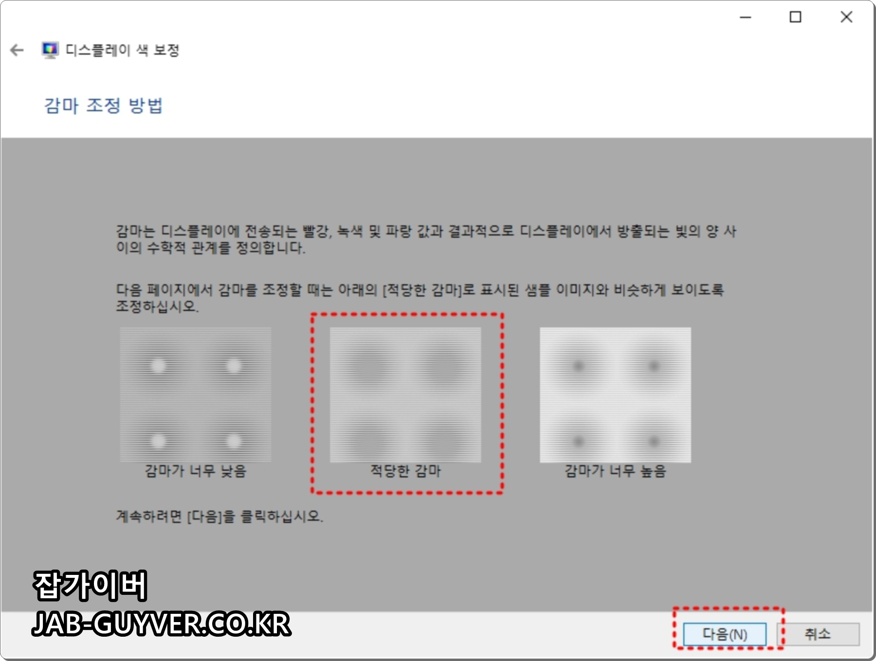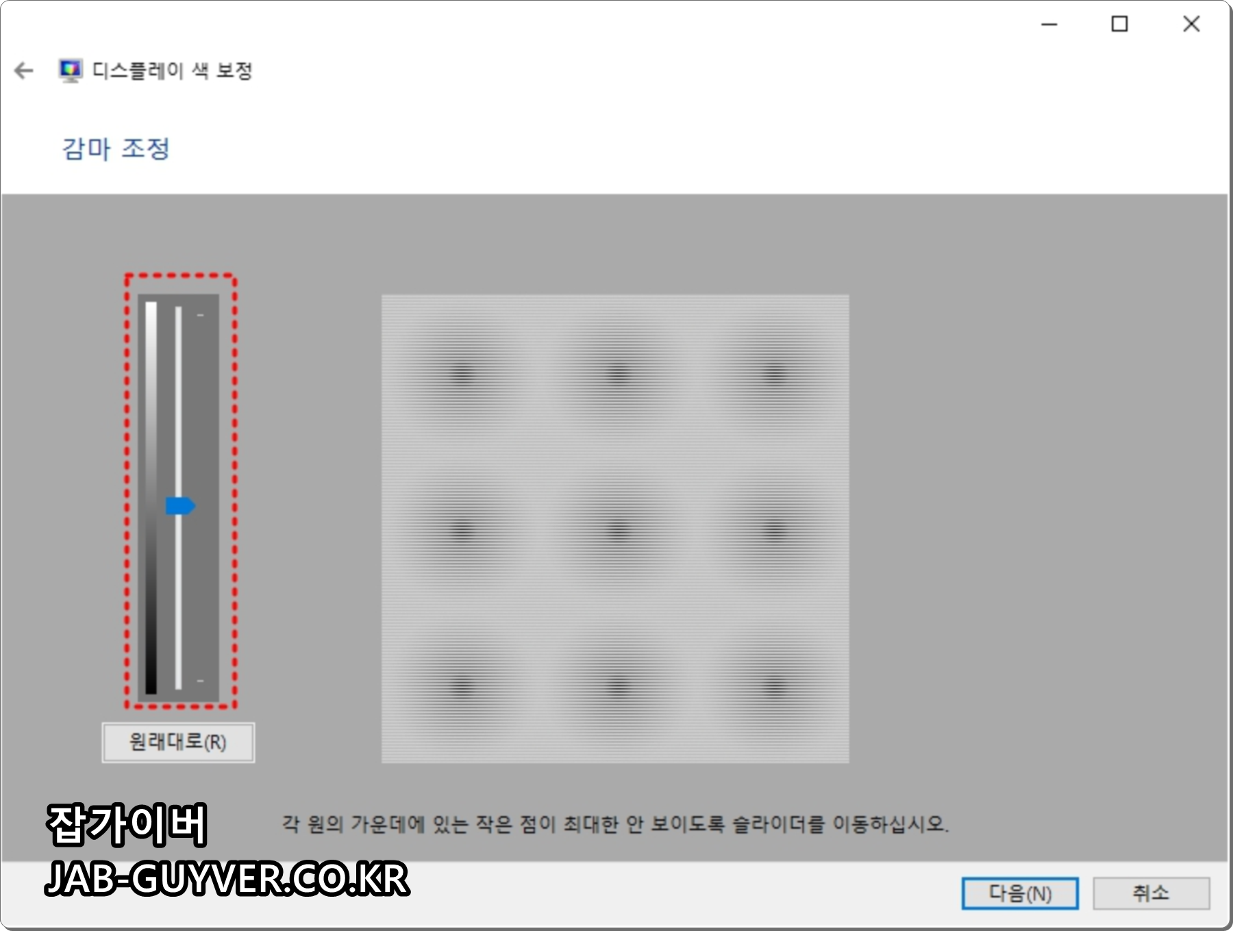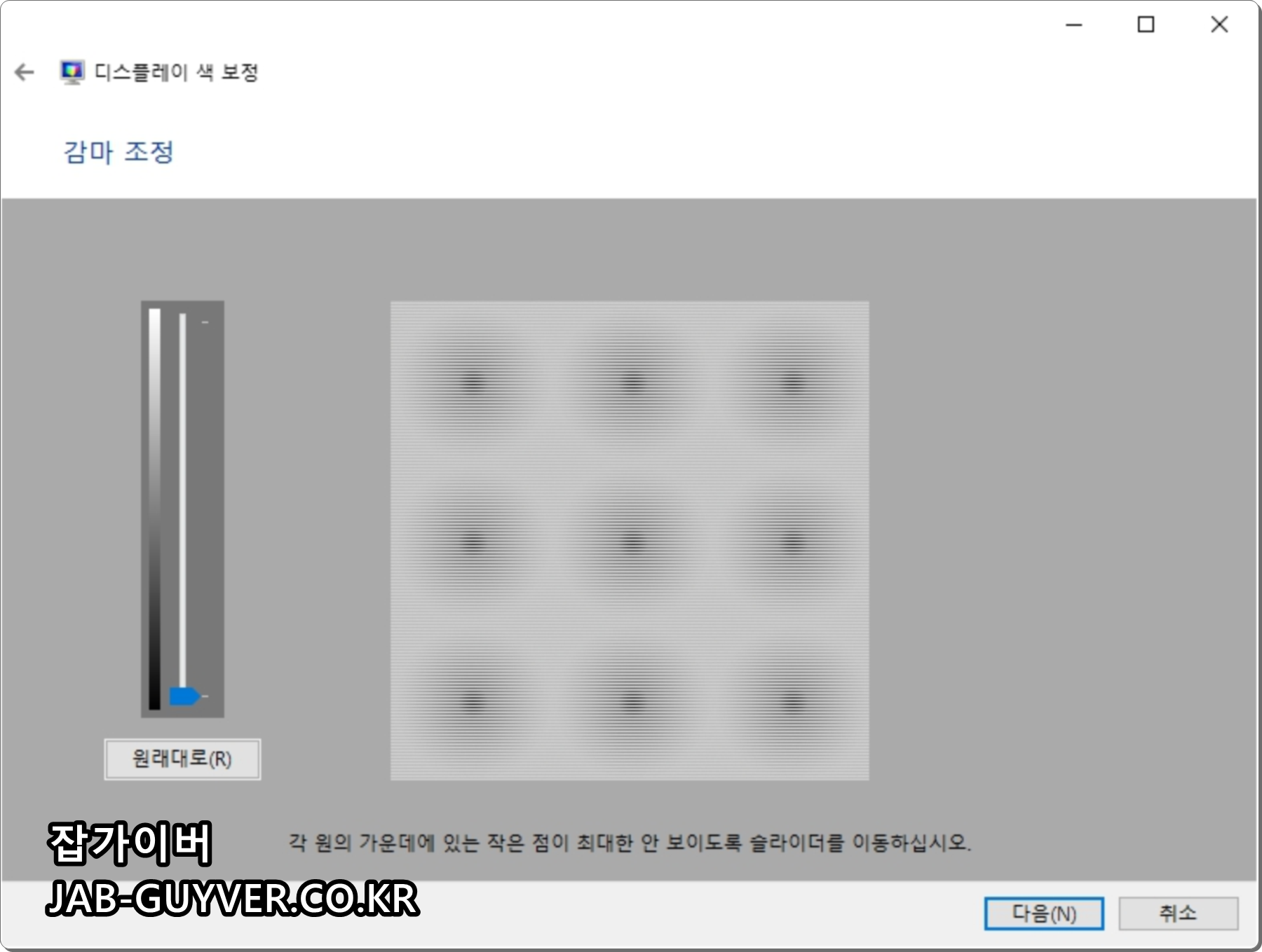 감마가 너무 낮거나 높은 경우 제대로 빨간색과 녹색, 파란색이 표시되지 않기 때문에 원형이 고르게 보이는 적당한 감마가 보이도록 조절해야합니다.