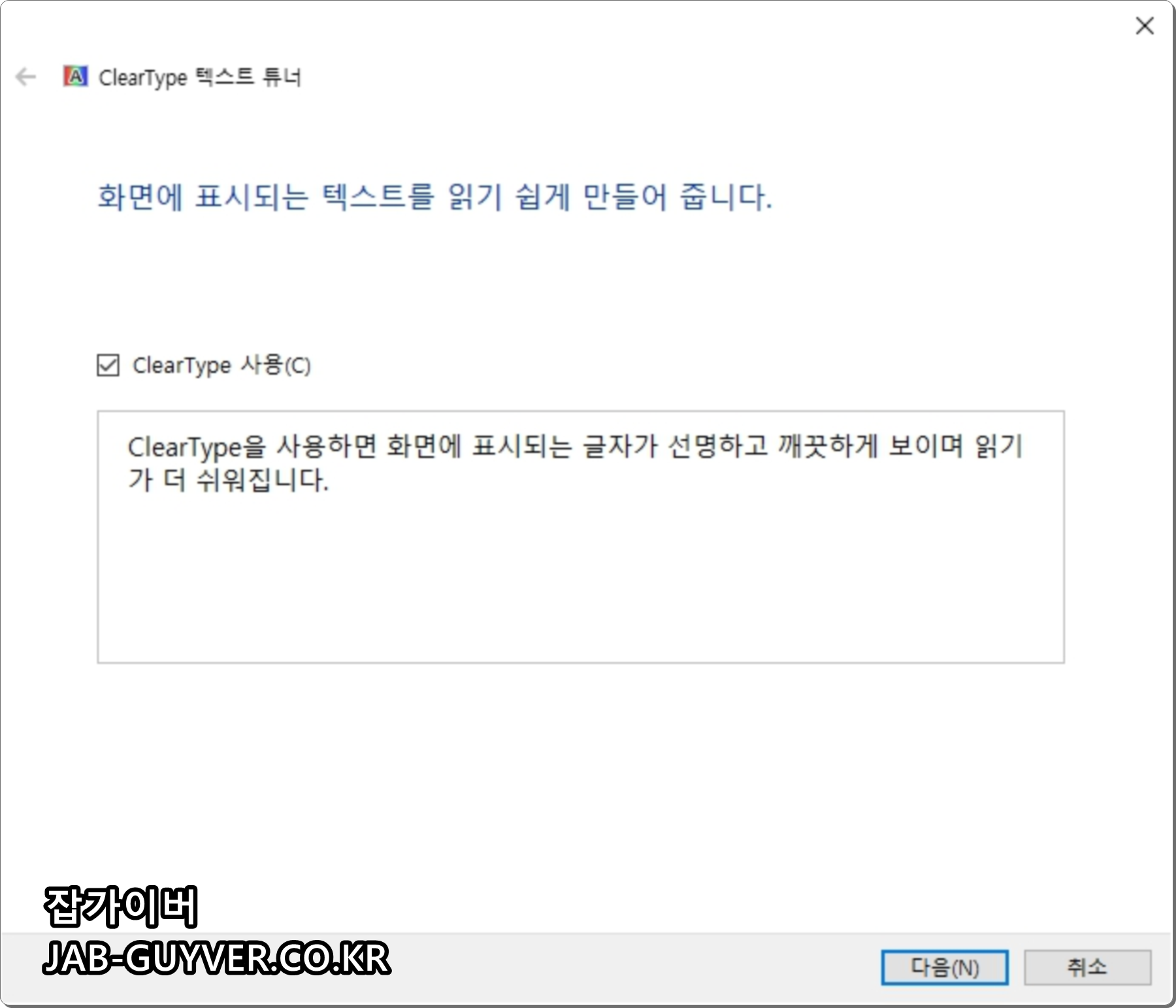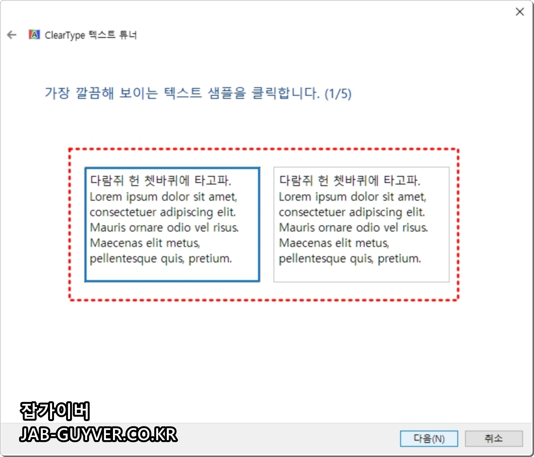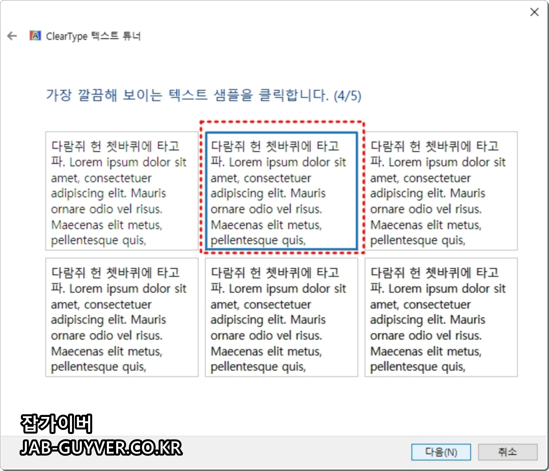모니터 색보정이 완료되면 자동으로 ClearType 텍스트 튜너이 실행되는데 모니터에서 보여지는 텍스트 글꼴이 선명하지 않은 경우 자신의 눈에 맞게 선명하게 하는 옵션으로 필요없다면 취소하면 됩니다.