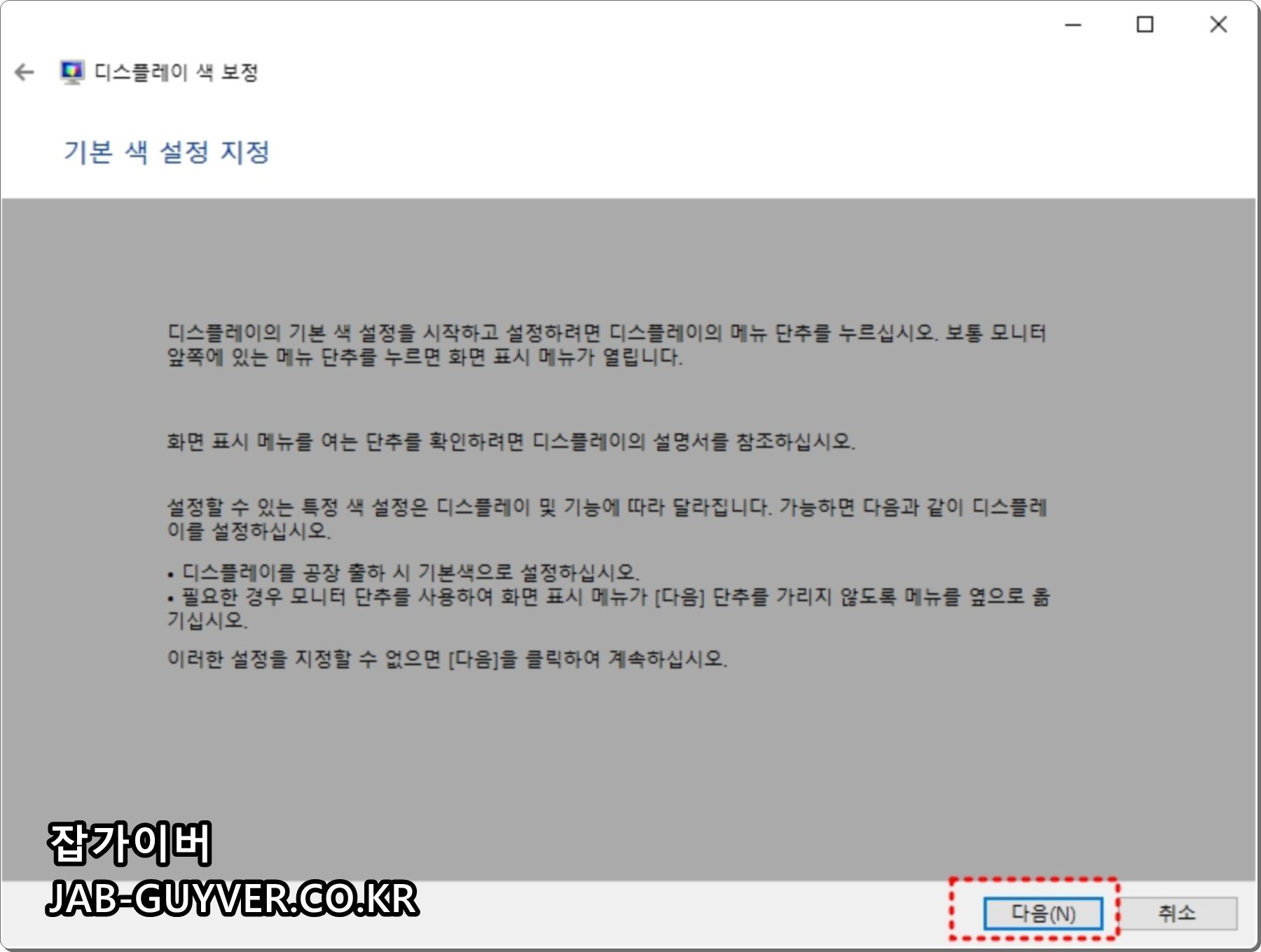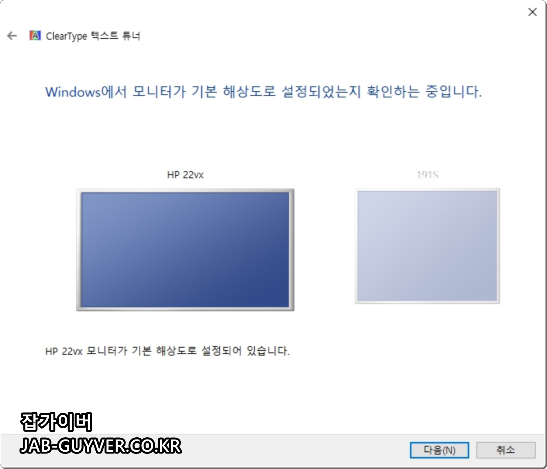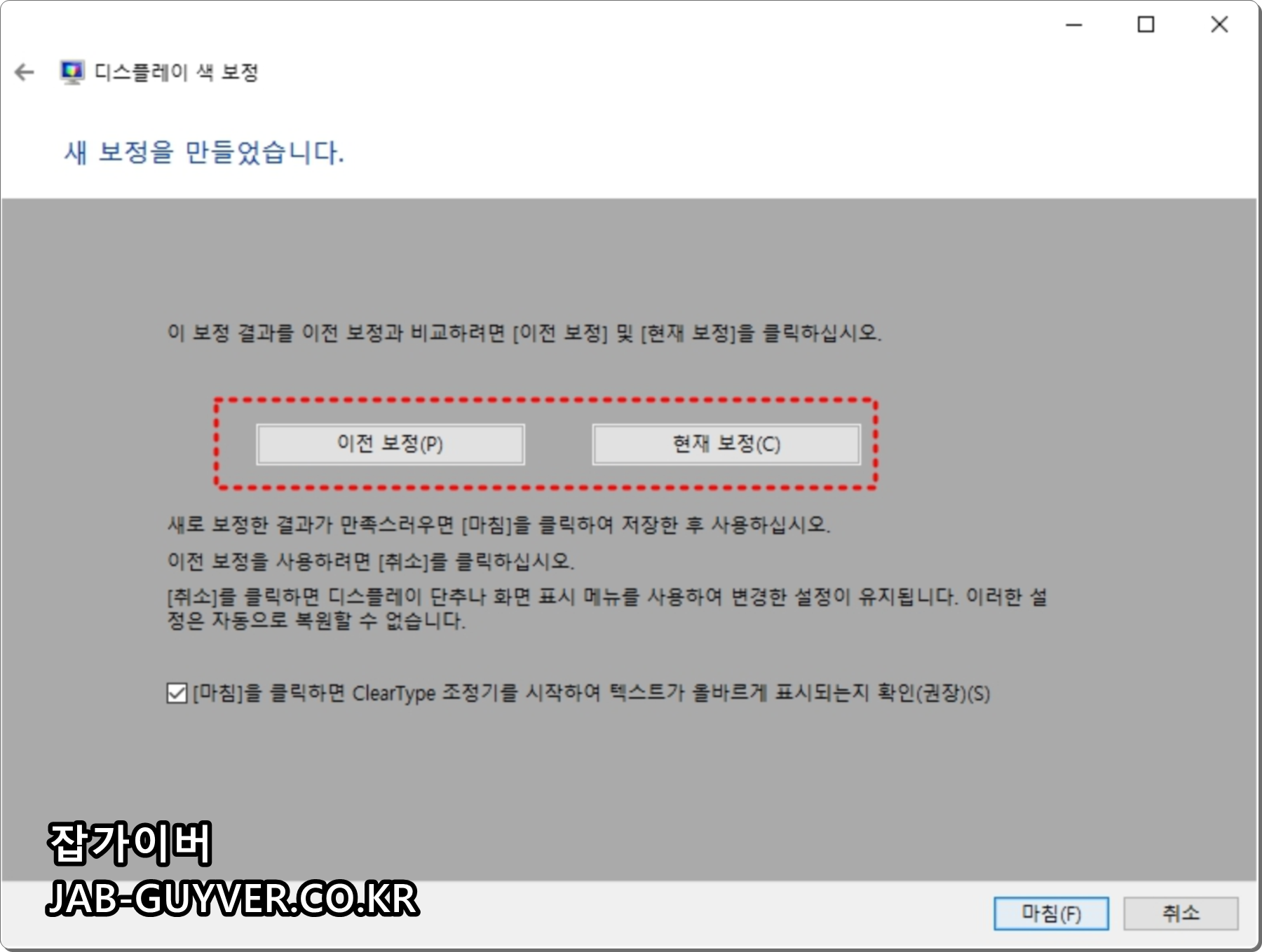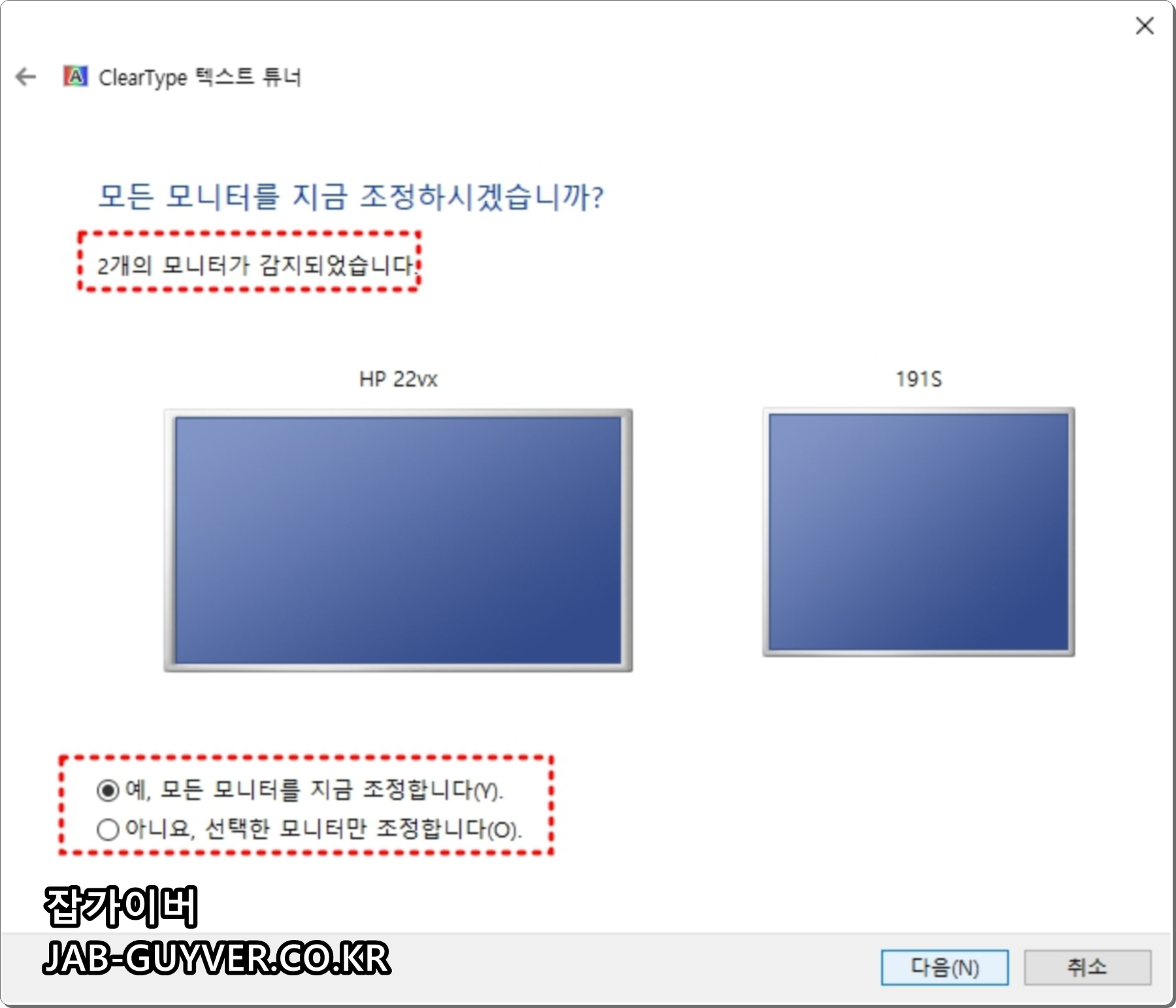 모니터 색보정이 완료되면 자동으로 ClearType 텍스트 튜너이 실행되는데 모니터에서 보여지는 텍스트 글꼴이 선명하지 않은 경우 자신의 눈에 맞게 선명하게 하는 옵션으로 필요없다면 취소하면 됩니다.