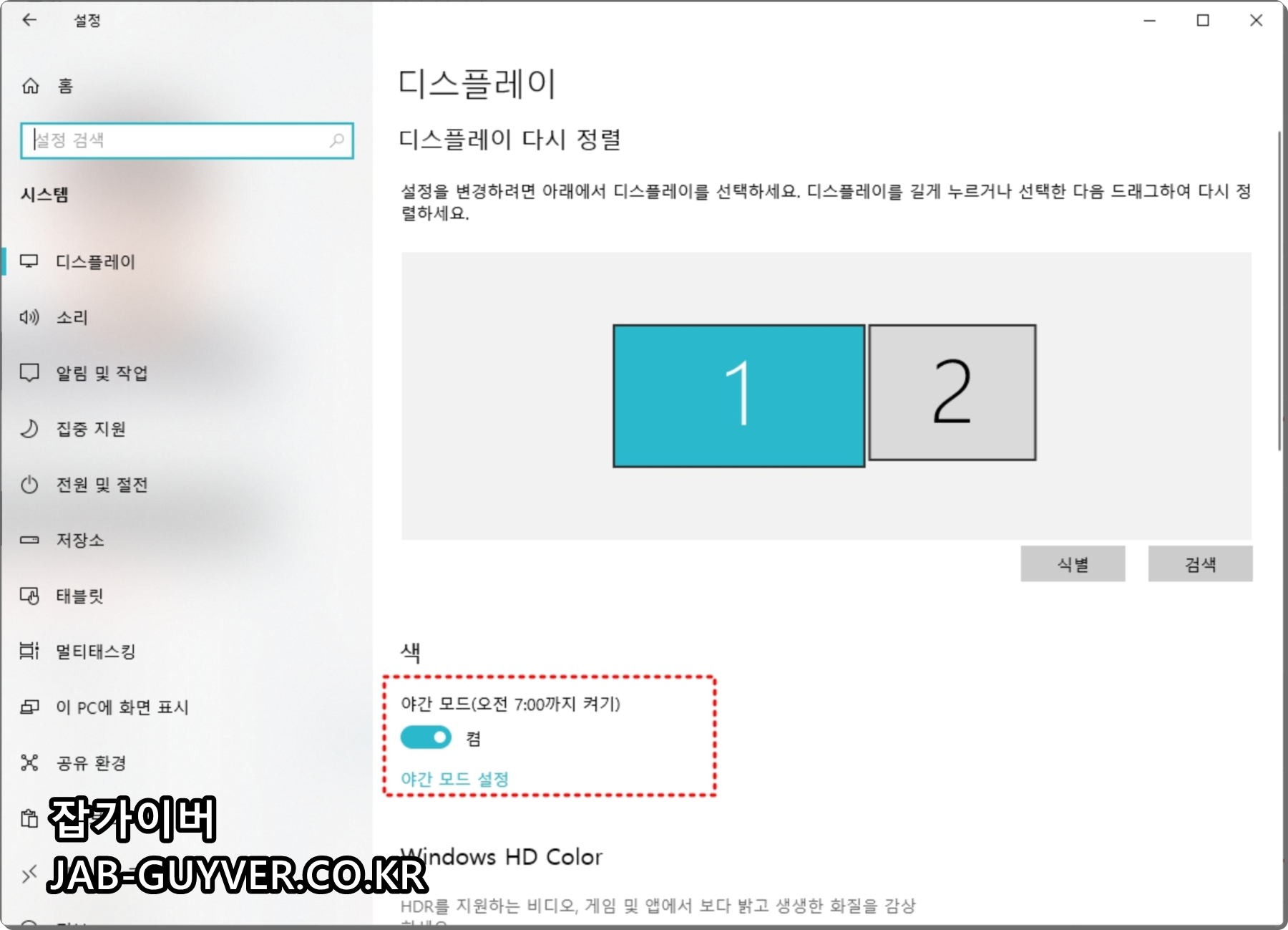 윈도우 야간모드 해제 블루라이트 차단