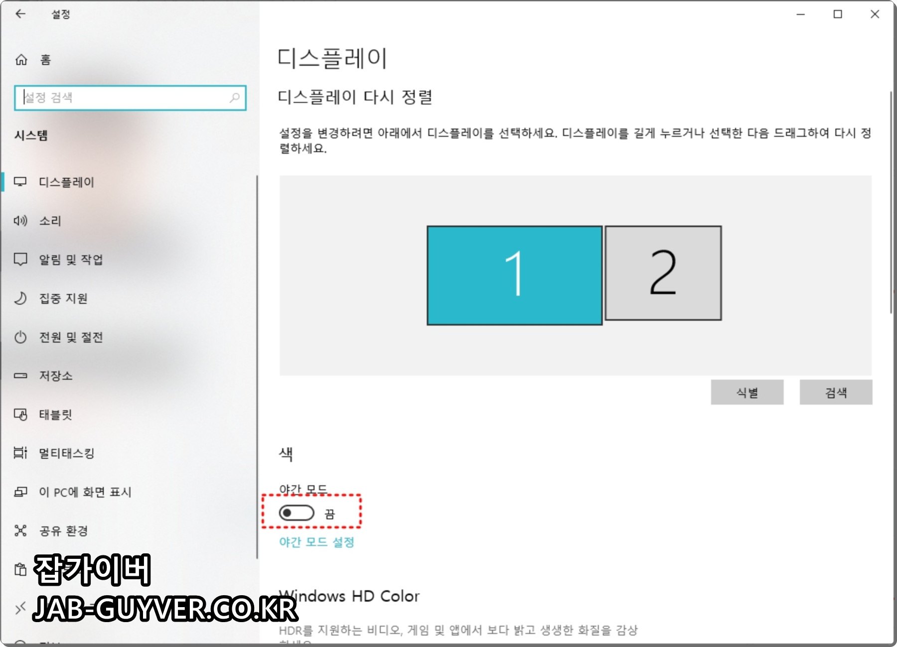 가장 먼저 윈도우에서 야간모드가 활성화 되어 있는지 확인합니다.