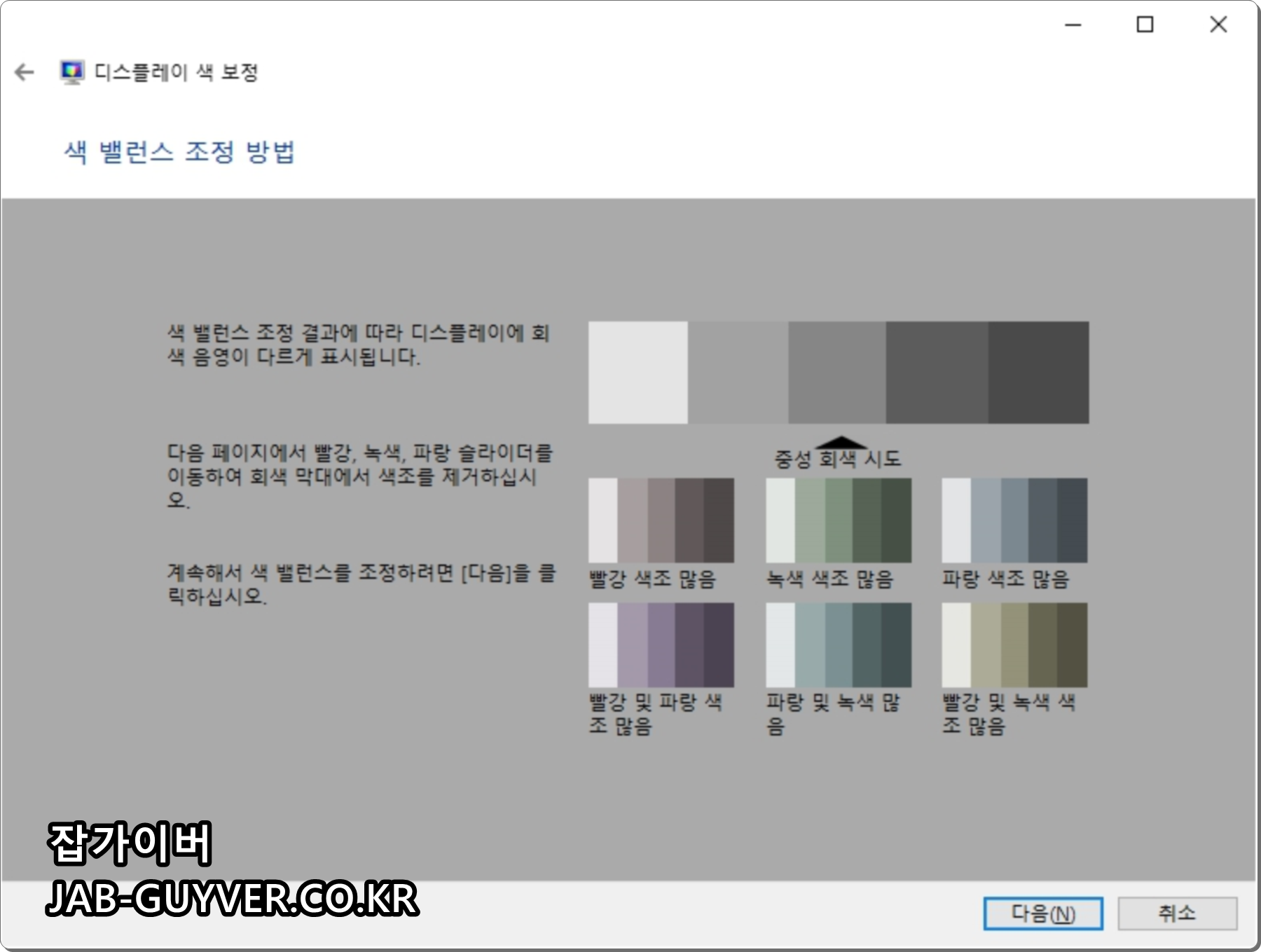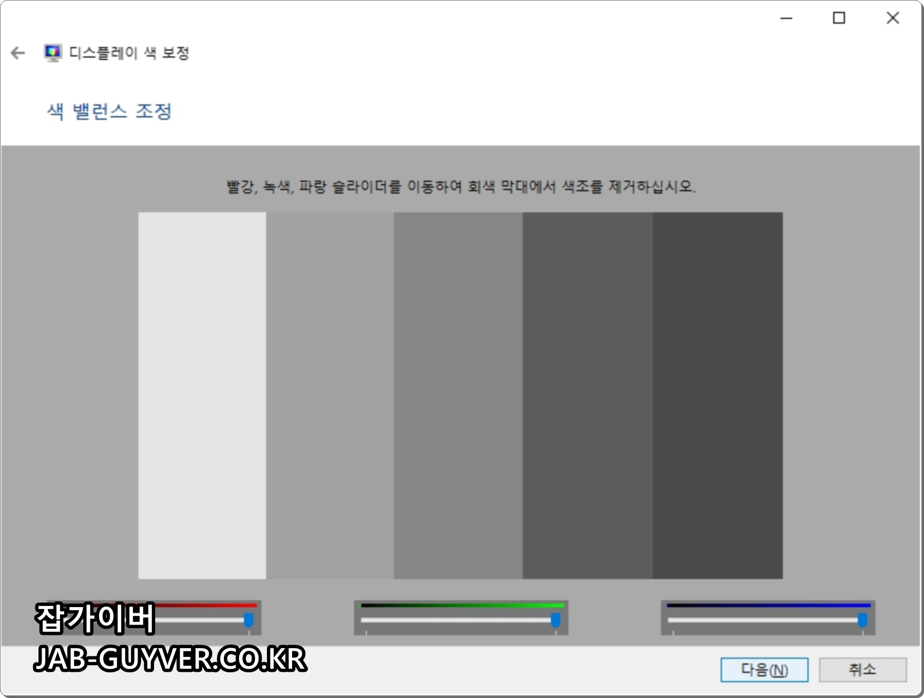 각 색상의 회색 막대를 제거할 수 잇도록 각 빨간색, 녹색, 파란색 수치를 조절하여 모니터 색보정을 완료합니다.