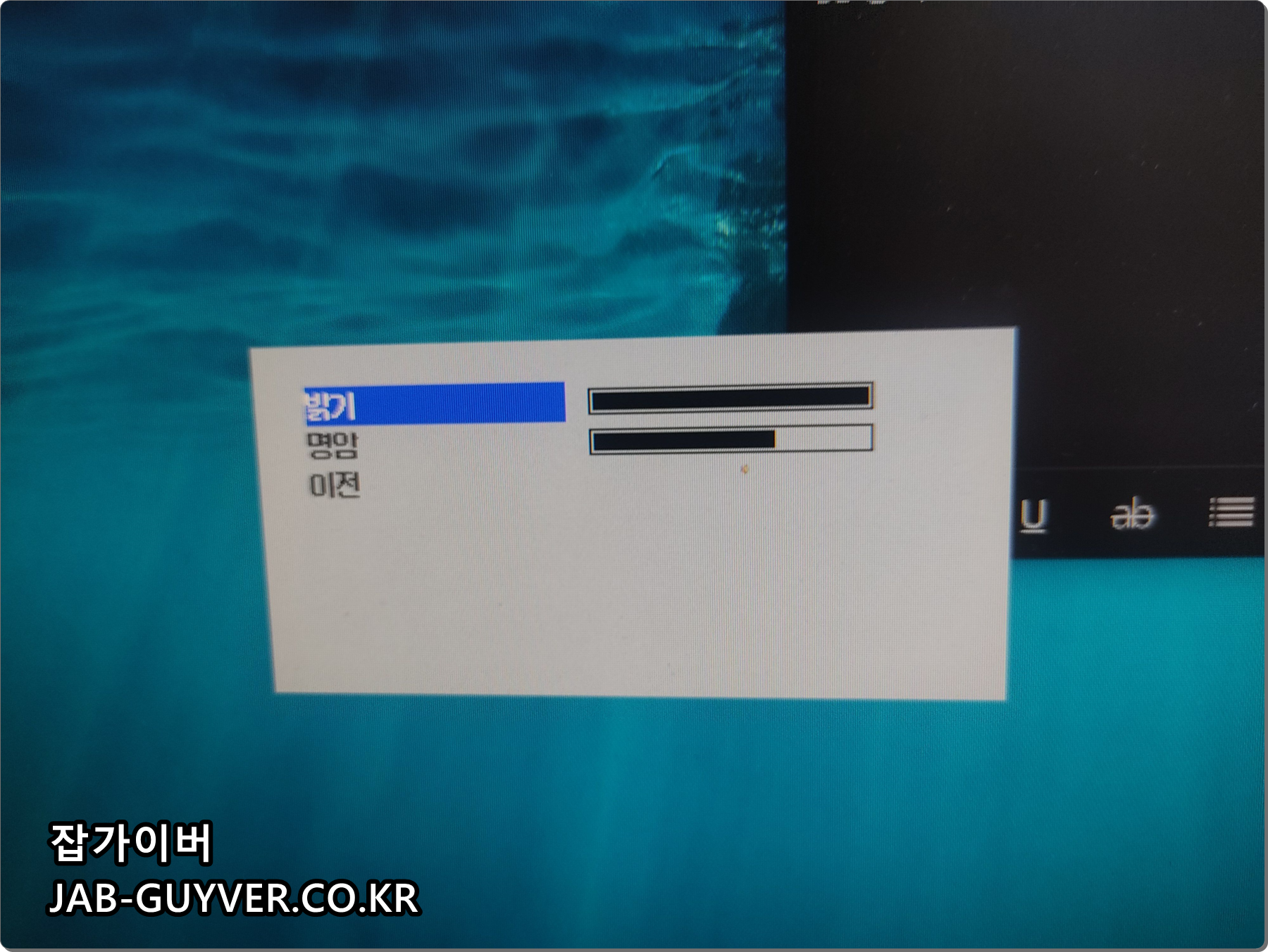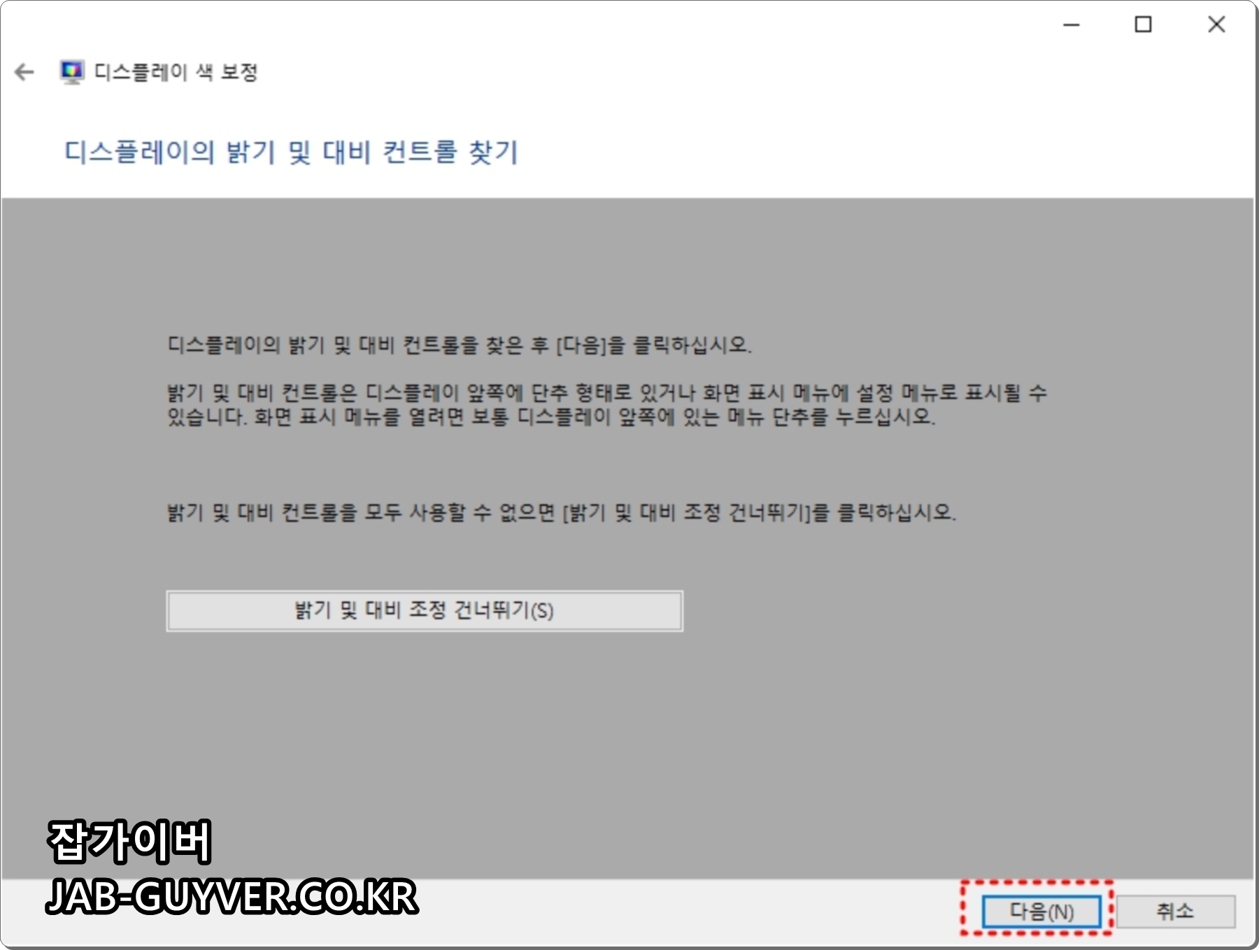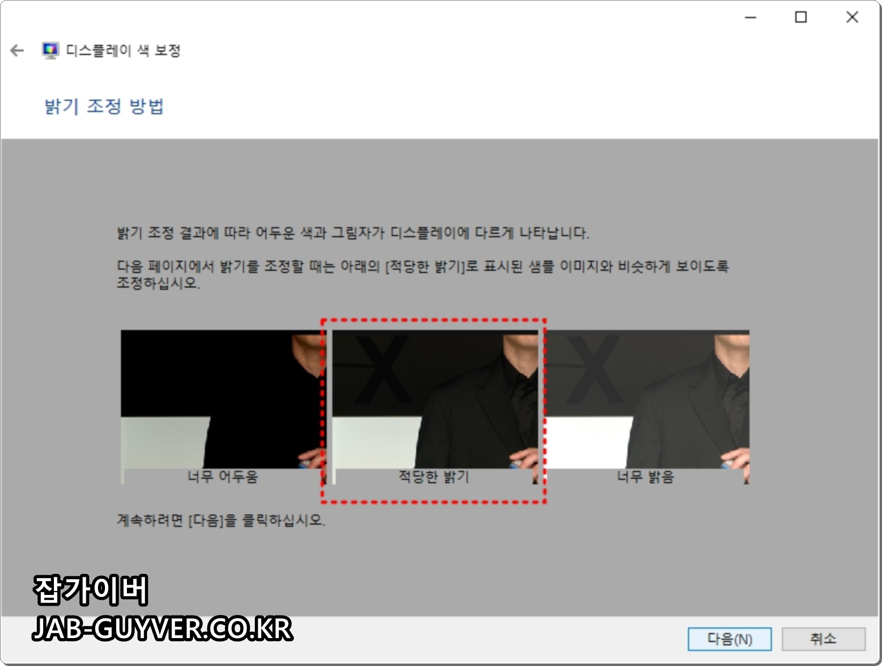 다음 모니터의 밝기 및 대미를 조절해서 어둡거나 밝은 색상이 제대로 보이도록 설정합니다.