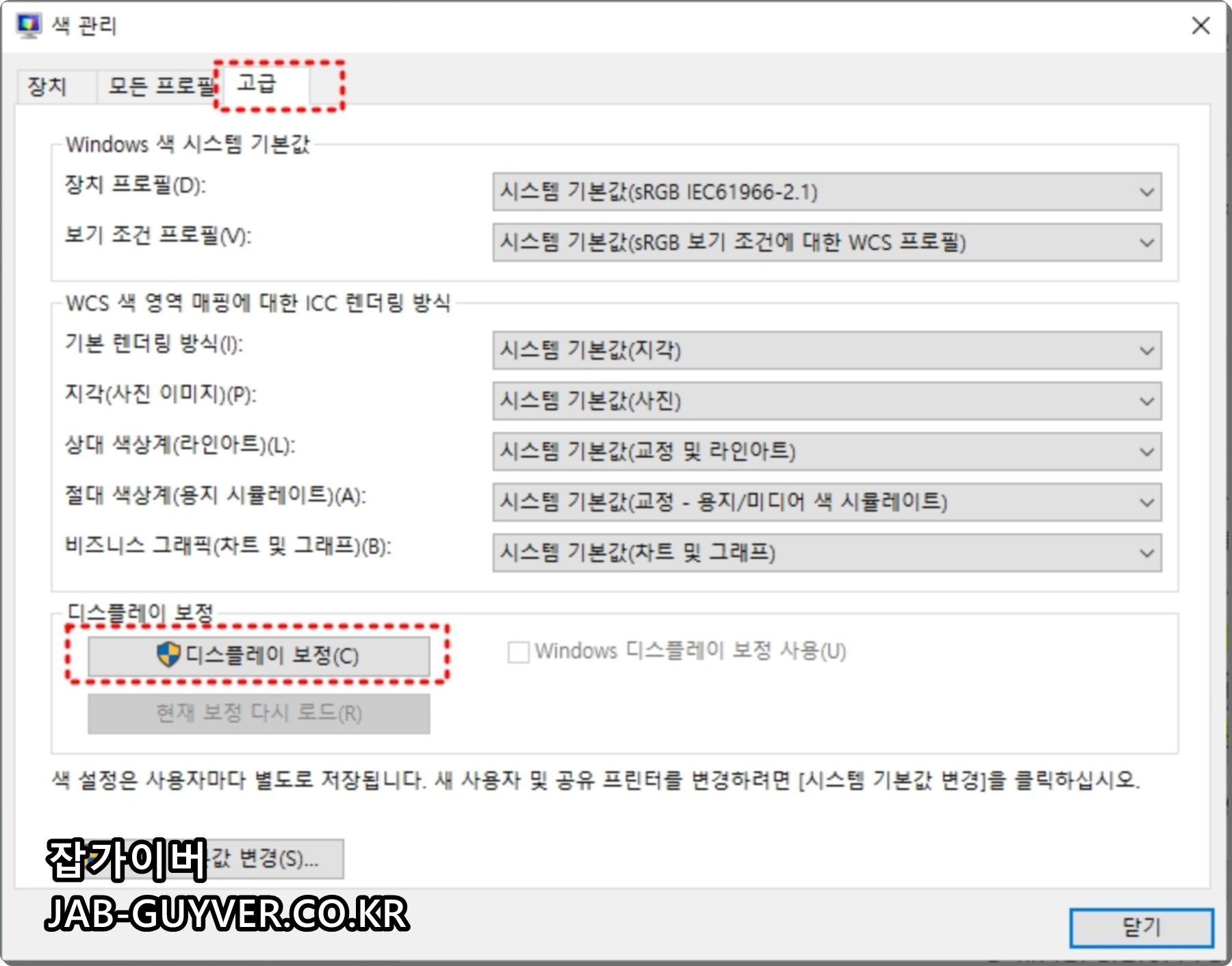 고급탭에서 디스플레이 보정을 진행합니다.