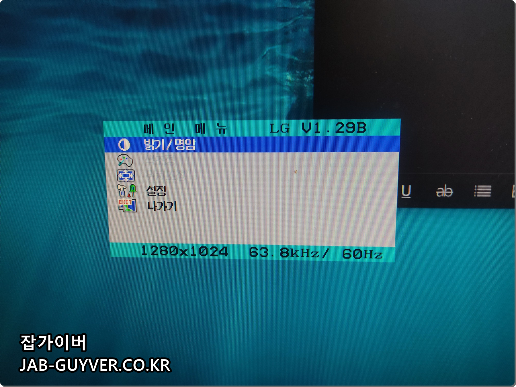 이 경우 실제 모니터의 설정버튼을 눌러 모니터의 밝기 / 명암 / 색보정을 실제 모니터에서 잘 보이도록 조절합니다.