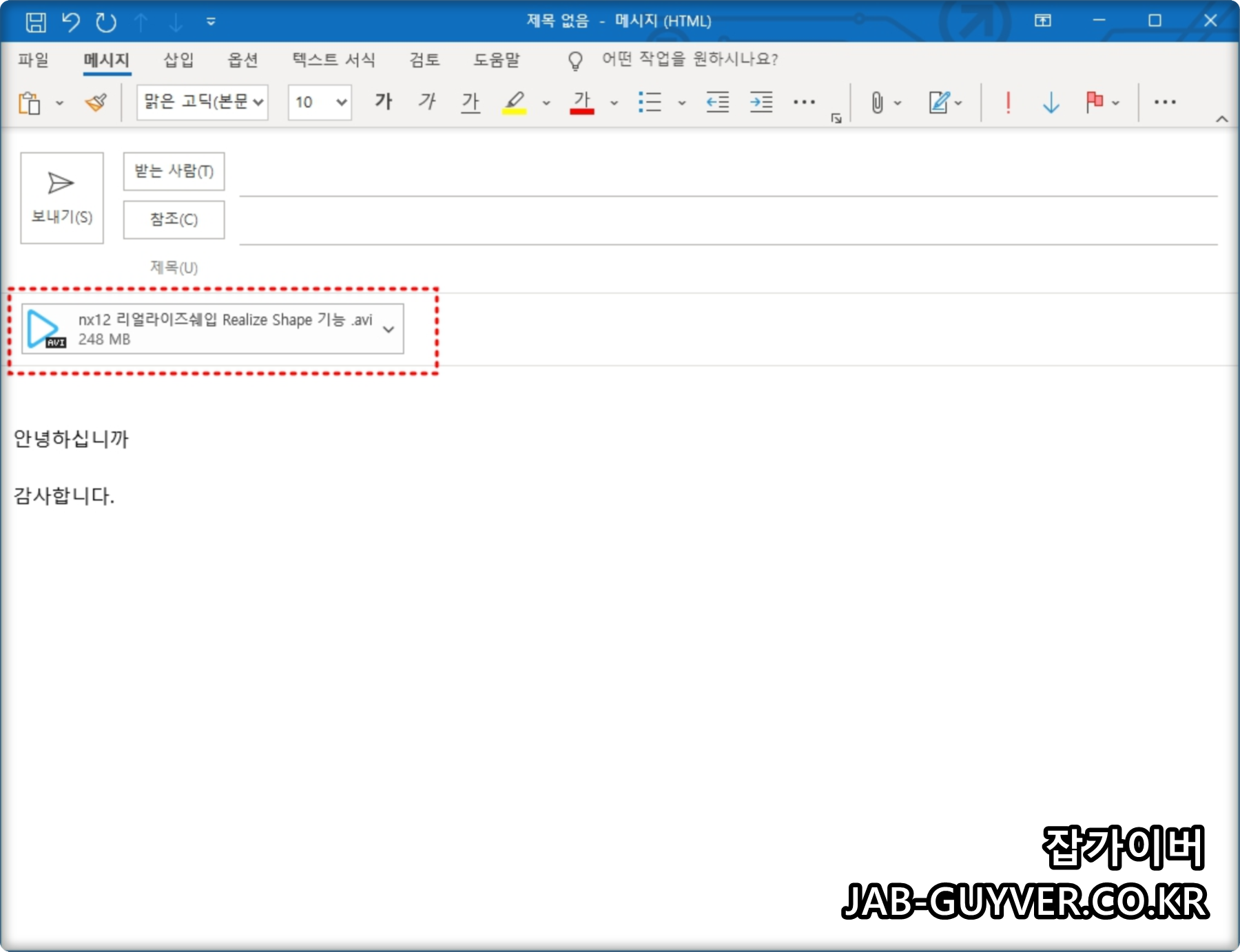 아웃룩2021 버전 기준 용량이 큰 동여상을 첨부하니 "첨부하려는 파일의 크기가 서버에 허용되는 크기보다 큽니다. 대신 파일을 공유위치에 저장하고 링크르 보내세요"라는 알림이 표시됩니다.