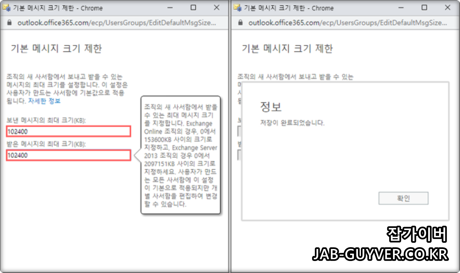 오피스365 아웃룩 파일첨부 용량변경