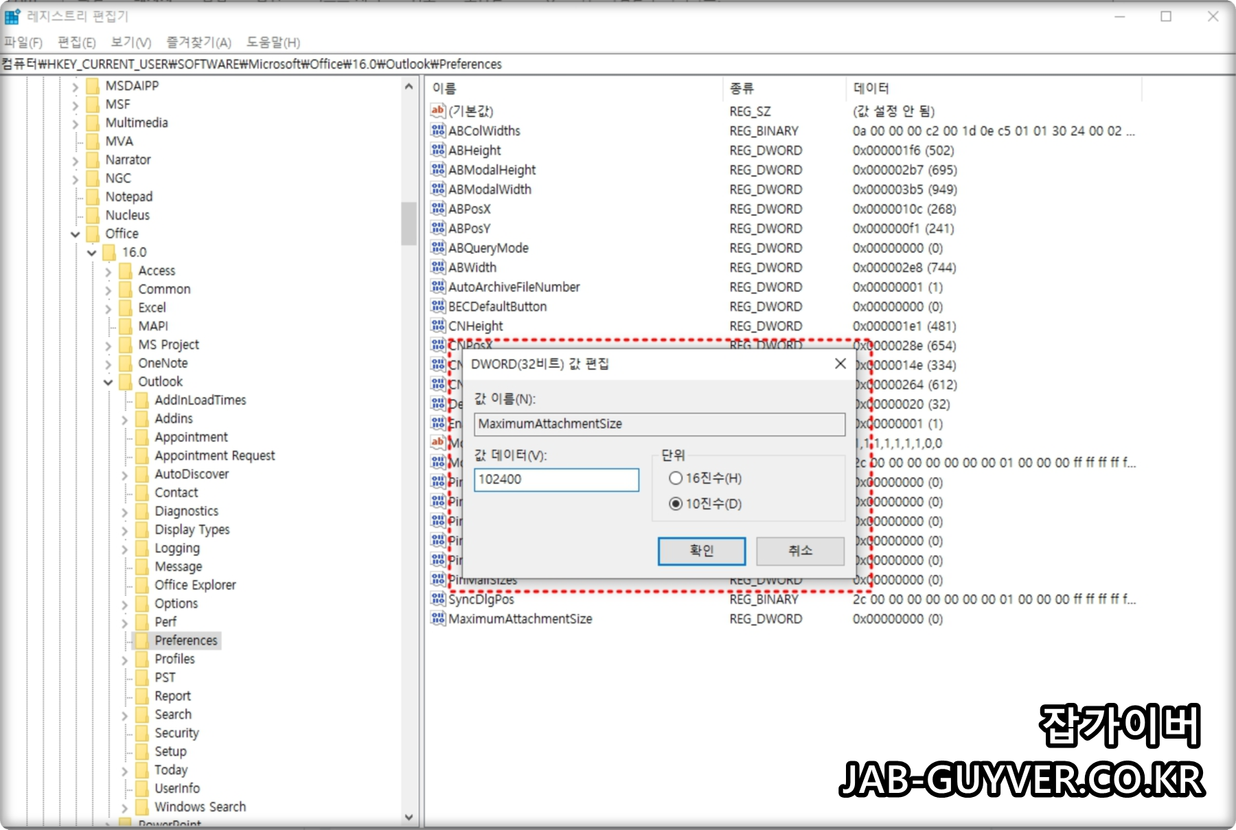 | Outlook 2016~2021 (설치형) | 레지스트리 편집기 | HKEY_CURRENT_USER\Software\Microsoft\Office\16.0\Outlook\Preferences | MaximumAttachmentSize (DWORD) | 102400 (100MB), 0 (무제한) | 레지스트리 변경 전 백업 필수 |