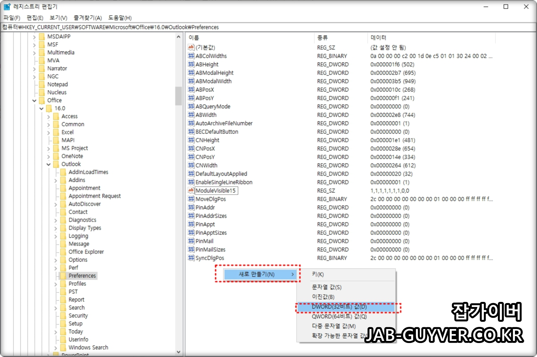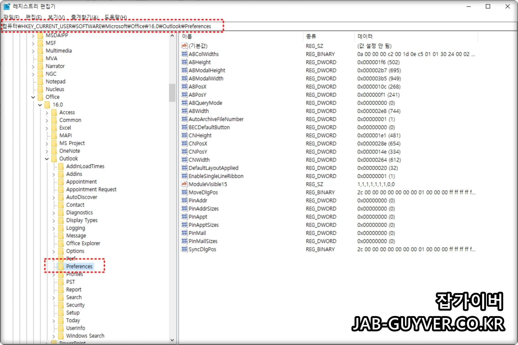 Outlook 2016 및 2019 및 2021 : HKEY_CURRENT_USER\Software\Microsoft\Office\16.0\Outlook\Preferences